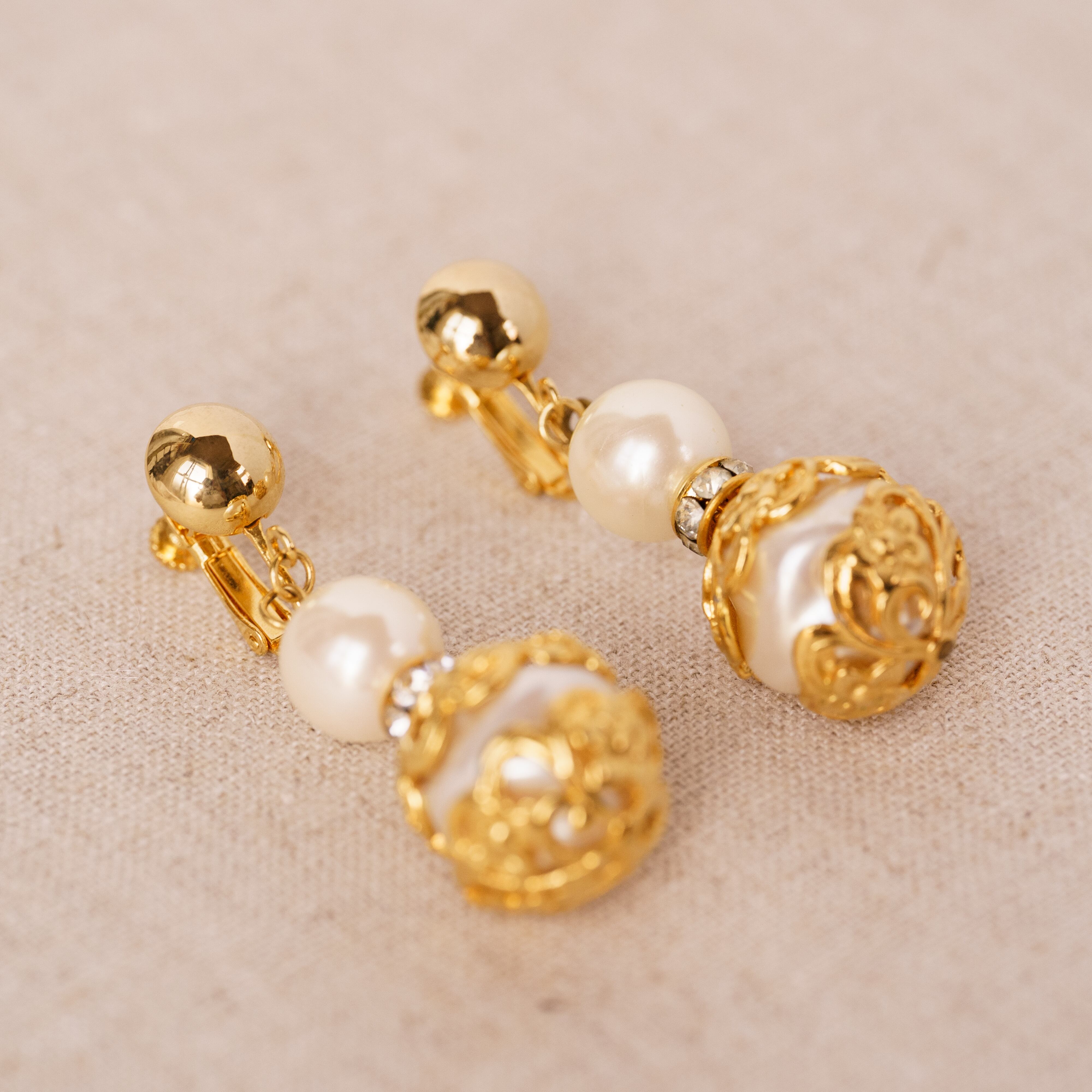 These vintage earrings beautifully combine the serene white tones of costume pearls with intricate metalwork. As they sway with your movement, they catch the light gracefully, adding a touch of sophistication to your look. The delicate interplay of elegance and understated charm makes this piece a timeless addition to any jewelry collection.