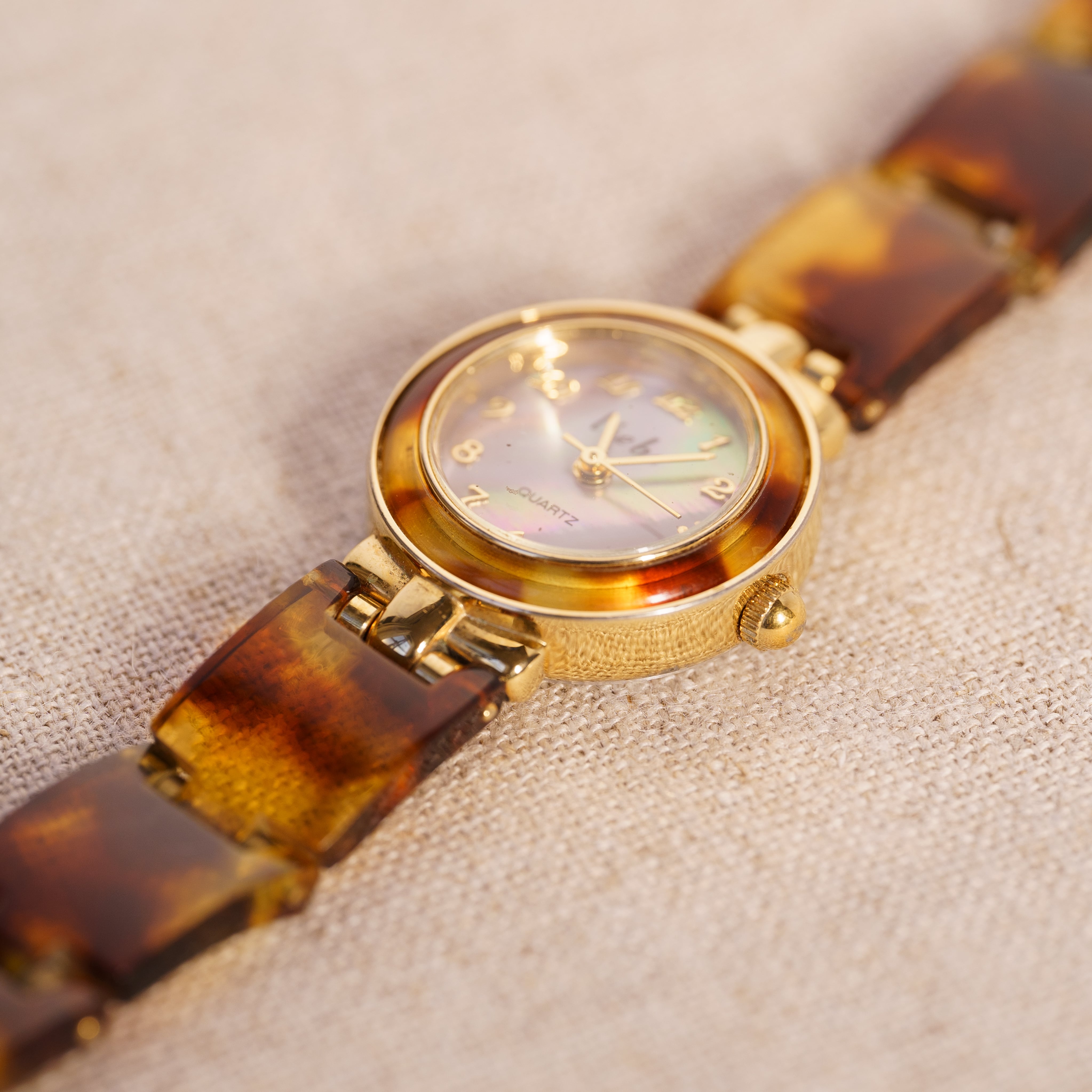 This vintage watch stands out with its rare and unique design. The tortoise-shell-inspired strap adds an air of elegance with its translucent texture, while the mother-of-pearl face gently shimmers with an aurora-like tone. The vintage gold detailing exudes weight and luxury, elevating your wrist with a refined charm. Its understated yet sophisticated presence complements both casual ensembles and formal attire seamlessly, making it a versatile addition to any collection.