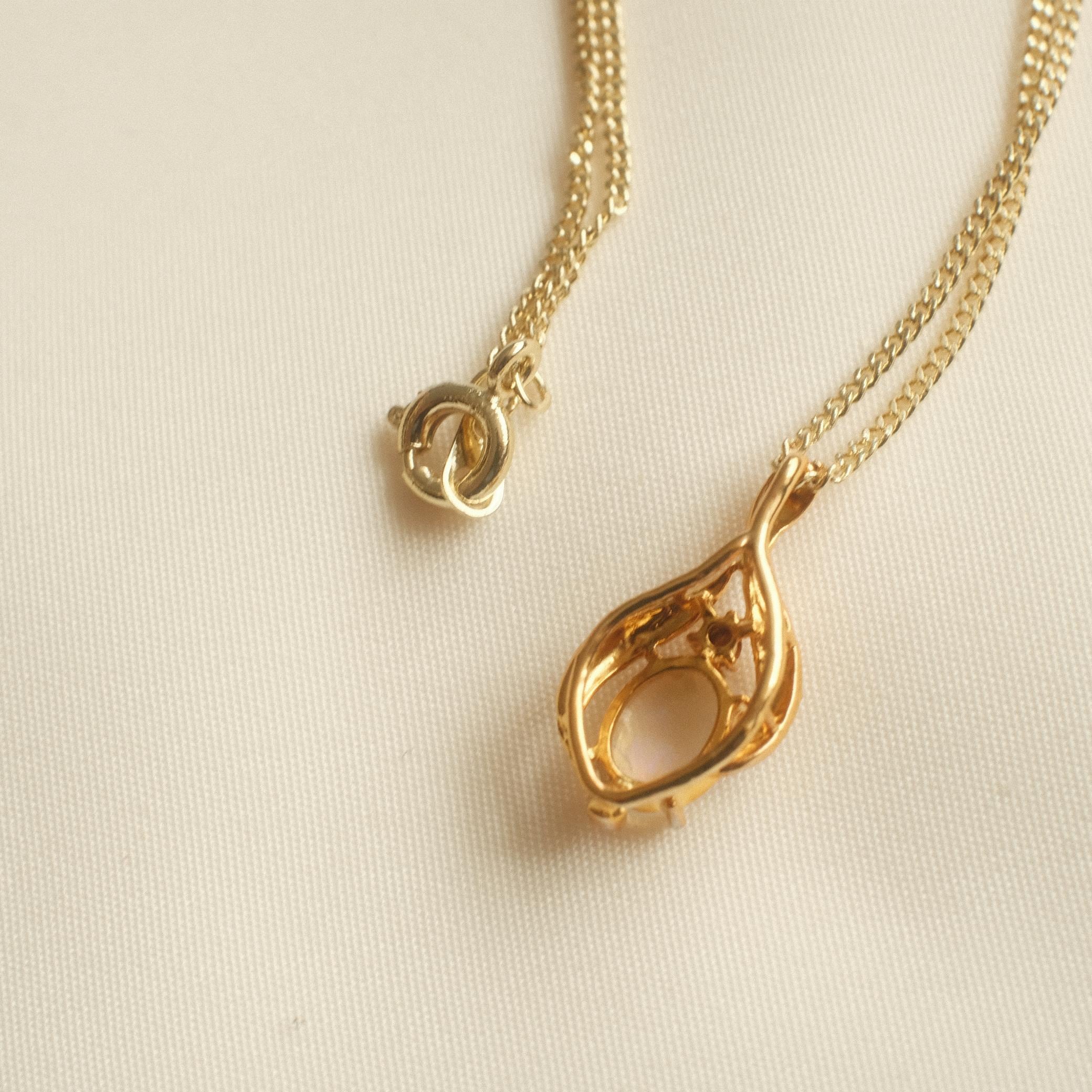 This vintage pendant features the rare beauty of Australian white opal, whose soft white tones shift subtly under the light, revealing delicate hints of blue and pink. The opal’s ethereal glow changes with every angle, casting a beautiful shimmer that adds an elegant touch to the décolletage, perfect for any occasion.