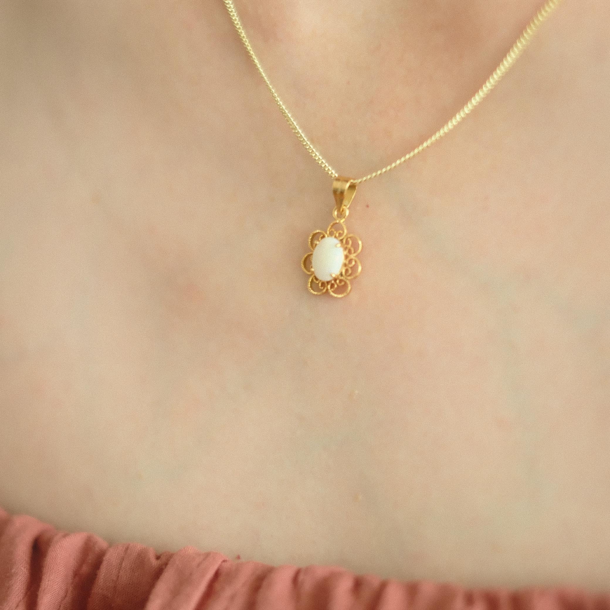 The filigree frame enhances the opal's natural elegance, accentuating its beauty with intricate detailing. The vintage gold setting adds weight and a sense of luxury, elevating the piece with an understated refinement. This pendant, with its delicate details and timeless appeal, is perfect for both everyday wear and special occasions, exuding grace and sophistication in every moment.
