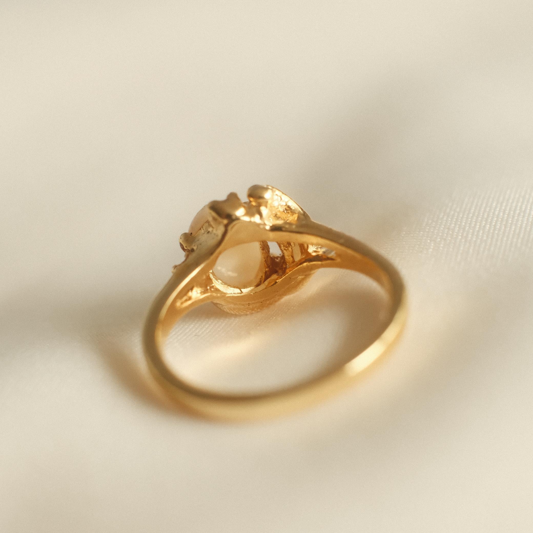 The vintage gold frame provides a sense of weight and luxury, accentuating the opal’s natural beauty. Tiny rhinestones add a soft sparkle, wrapping the finger in a gentle nuance that catches the light just enough to captivate. This piece, with its understated yet striking presence, transitions effortlessly from everyday elegance to more special occasions.