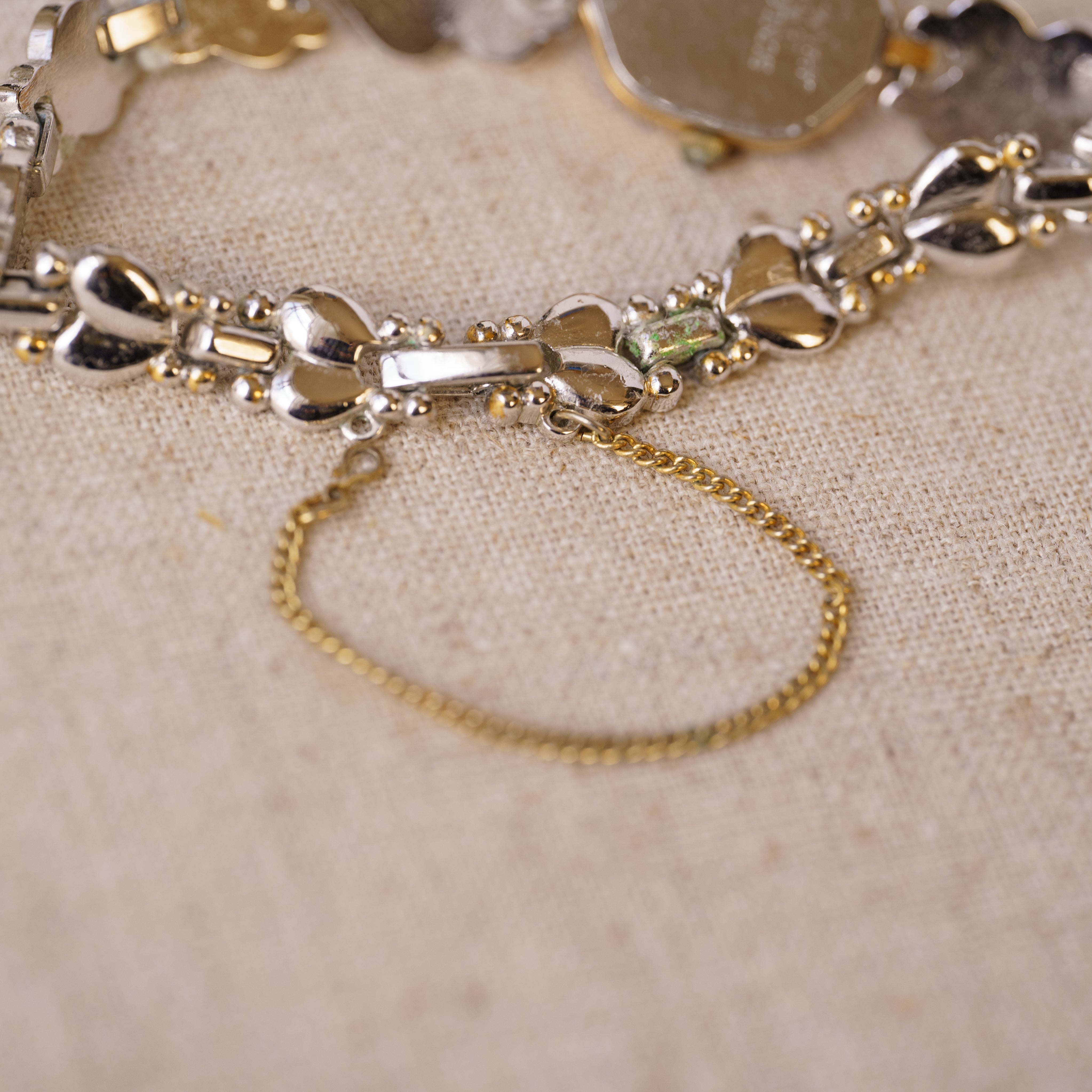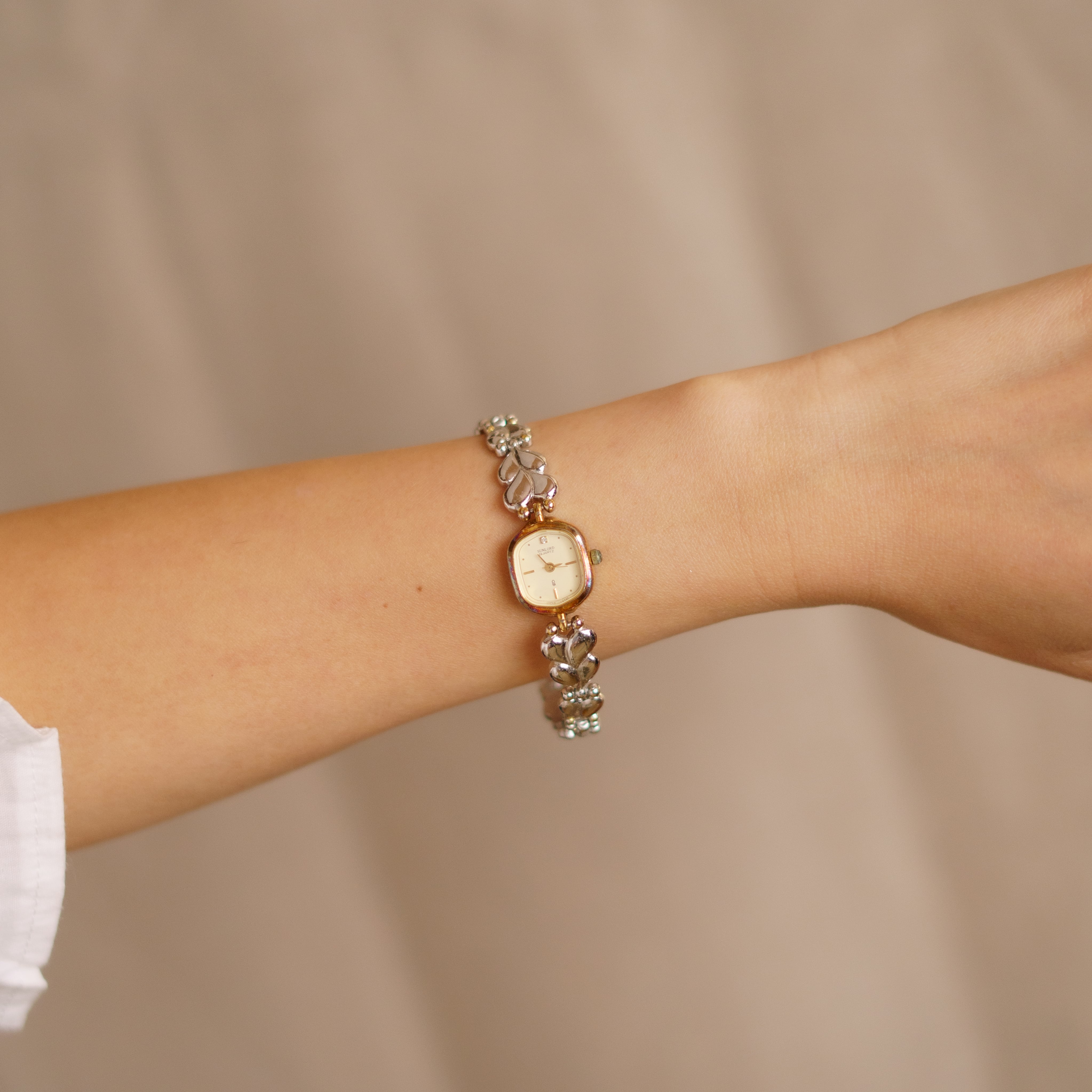 This vintage watch features an elegant, rounded hexagonal face, complemented by a bracelet with abstract heart motifs. The design brings both glamour and playful charm to the wrist, adding a touch of sophistication with a whimsical twist. The natural stones on the face add a subtle yet refined shimmer, creating a simple yet sophisticated presence.