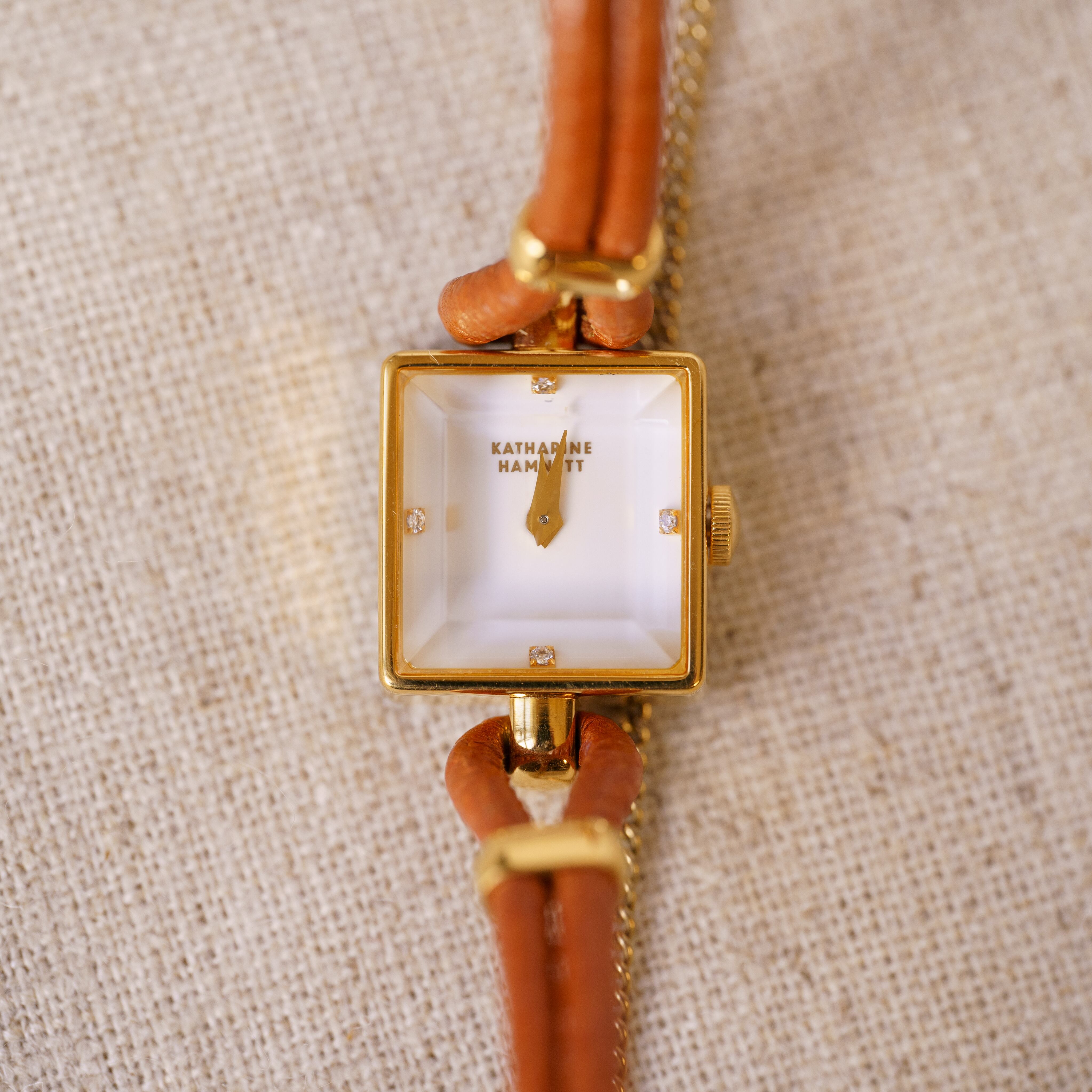 モードなスクエアフェイスは、小ぶりなサイズ感で華奢な印象を与え、スリムなレザーのダブルストランドベルトが手もとにエレガントな雰囲気を添えます。フェイスに施された天然石は、控えめながらも上品な輝きを放ち、シンプルでありながら洗練された印象を与えます。ブレスレット感覚でデイリーからフォーマルまで、どんなスタイルにも溶け込むタイムレスなウォッチです。