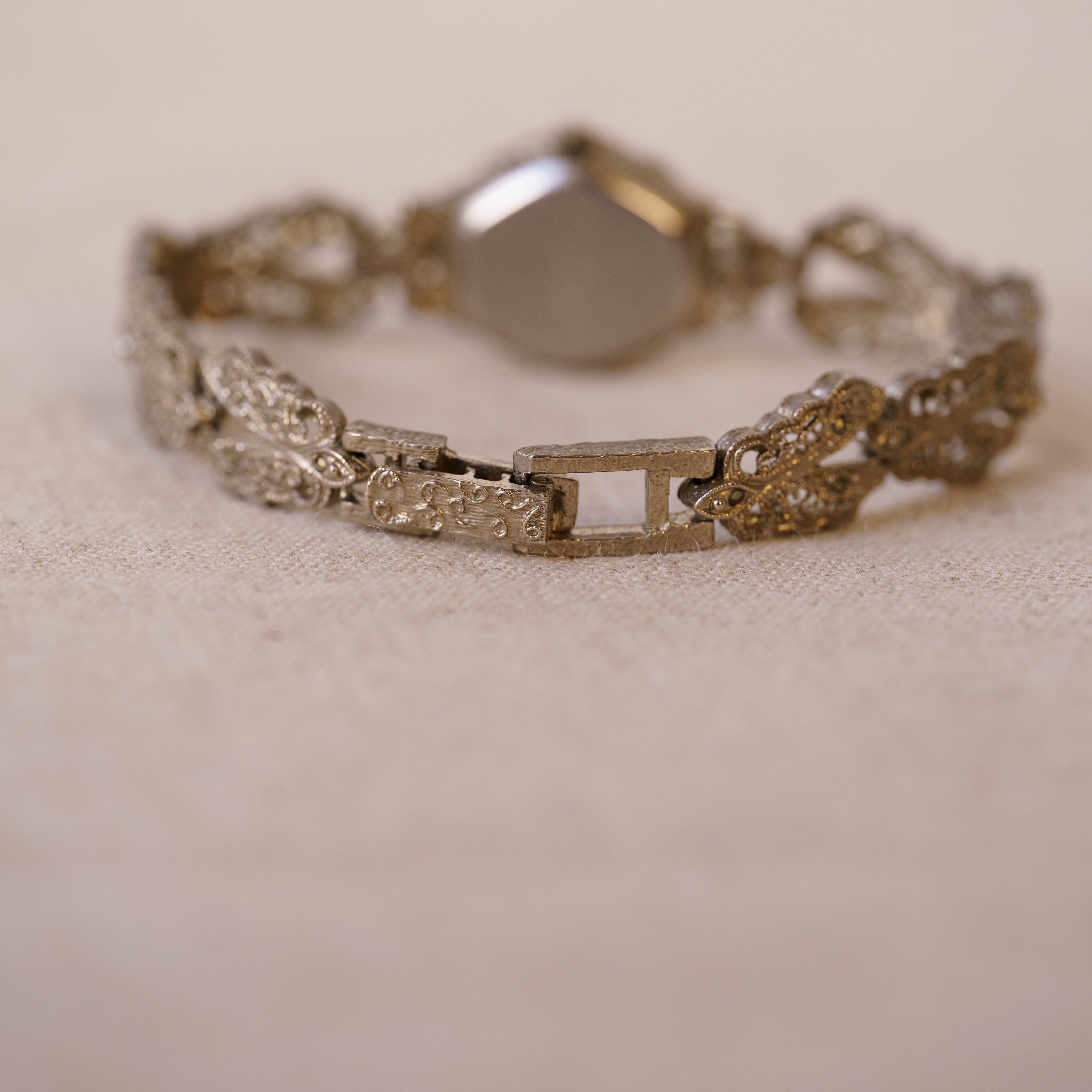 アール・ヌーヴォーにインスパイアされたデザインが特徴のヴィンテージウォッチ。丁寧に施されたメタルワークとストーン使いが、クラシカルでありながら華やかな雰囲気を手元に与えます。ブレスレットのように着けられるスタイリッシュなシルエットが魅力的で、まるでアクセサリーの一部のように日常使いにも最適です。