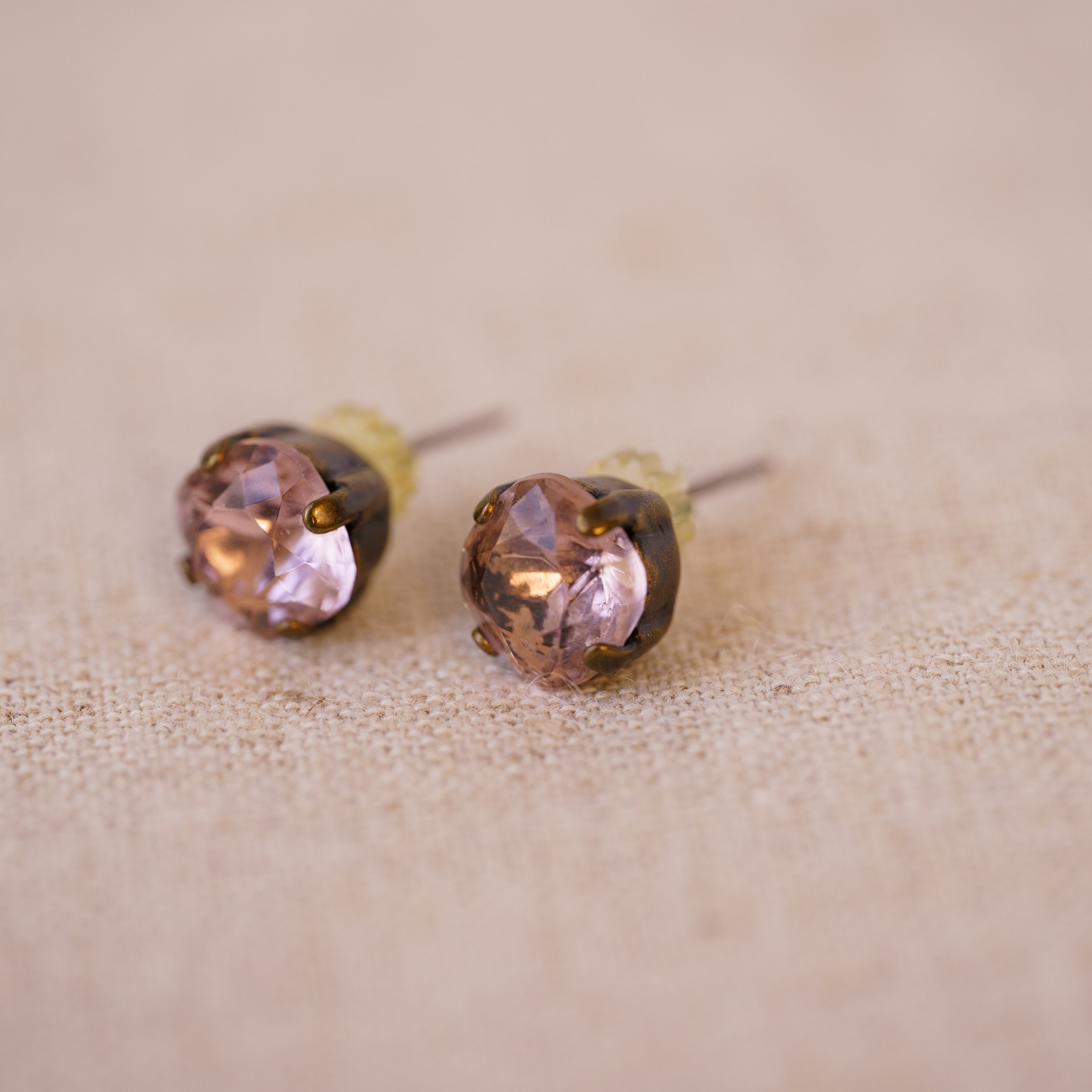 These vintage earrings feature an elegantly cut colored glass form. The soft lavender tone, combined with the transparency of the glass and the old silver frame, creates a stunning marriage of beauty. The tiny silhouette and gentle sparkle add subtle elegance to the face. Simple yet striking, they blend effortlessly with any outfit, adding a refined accent to your look.