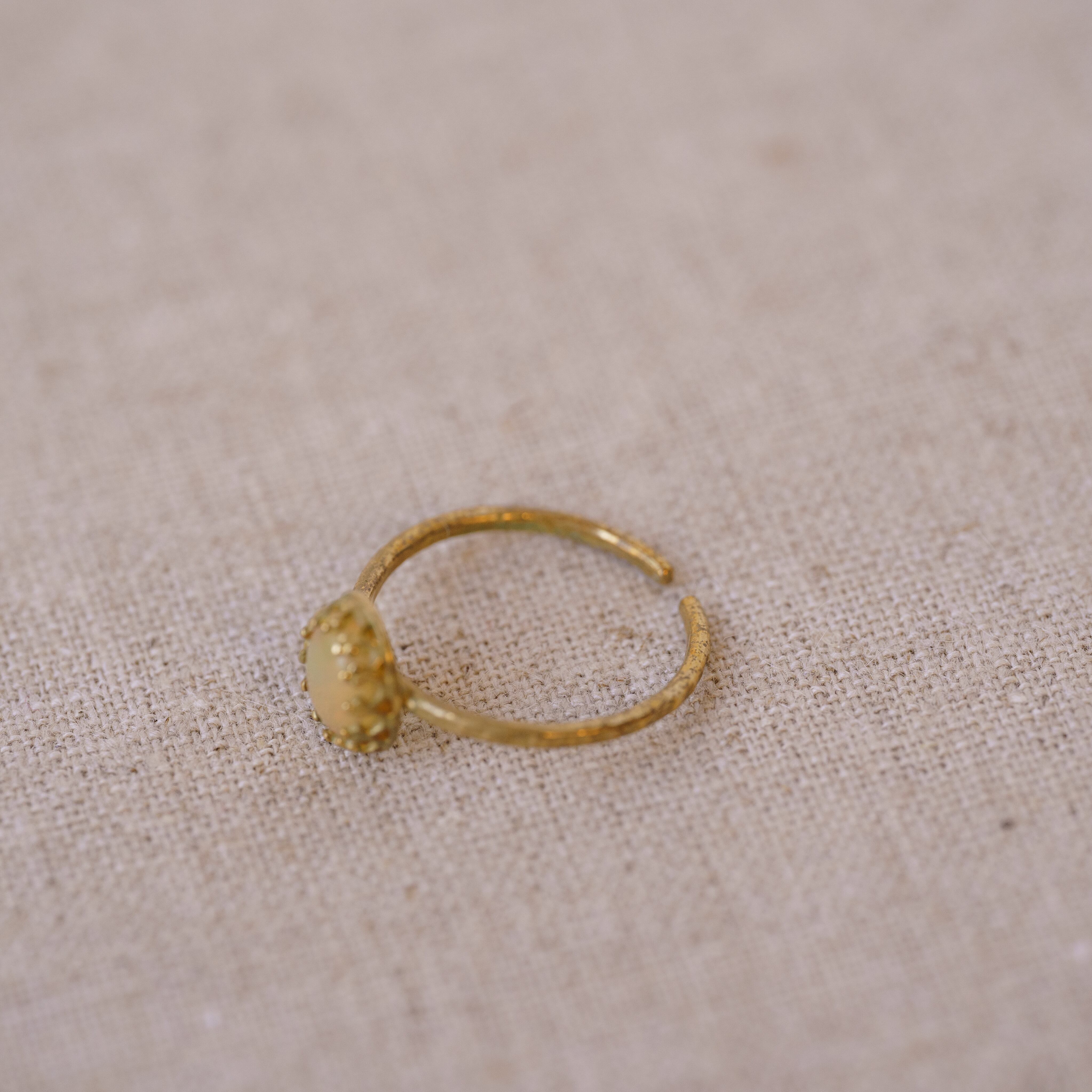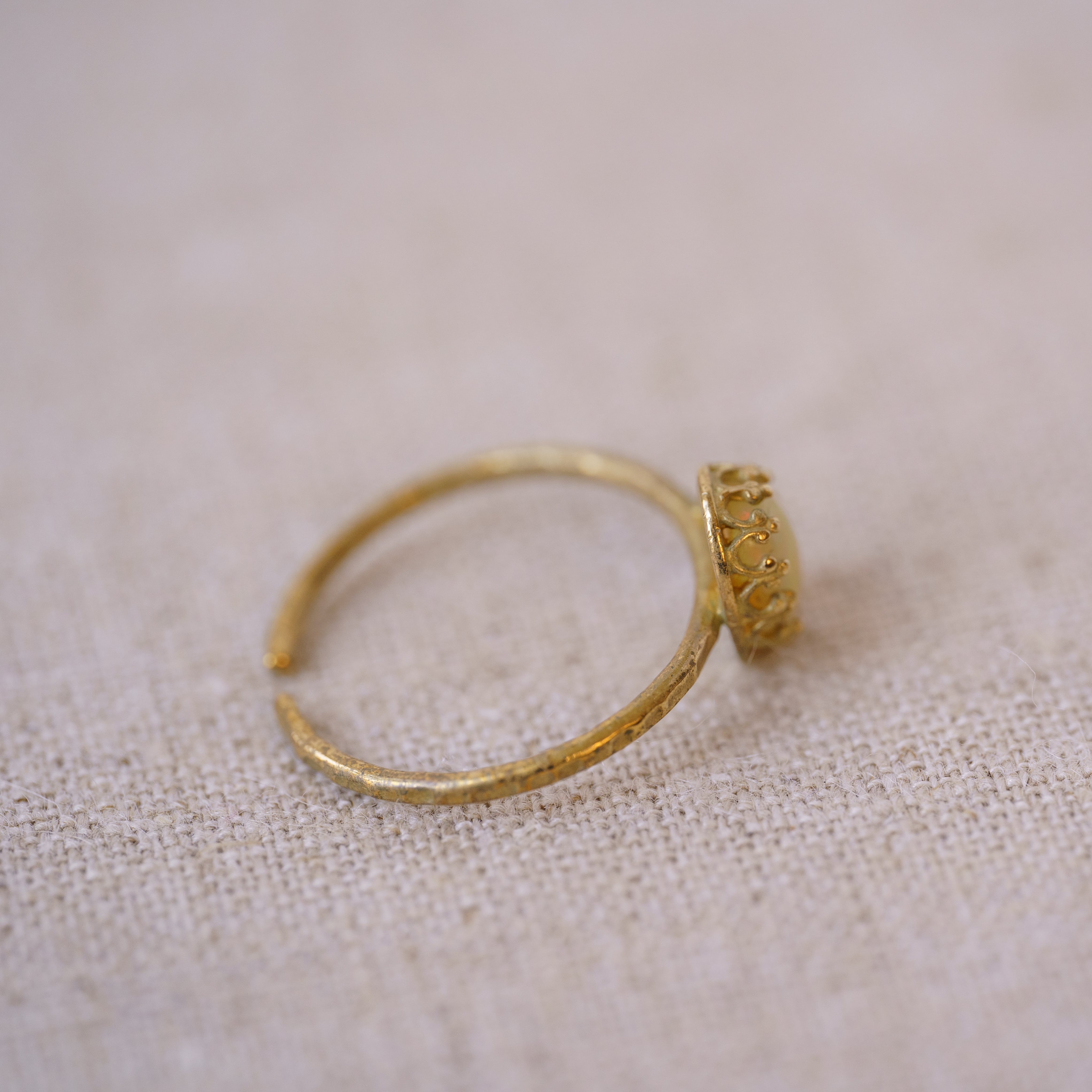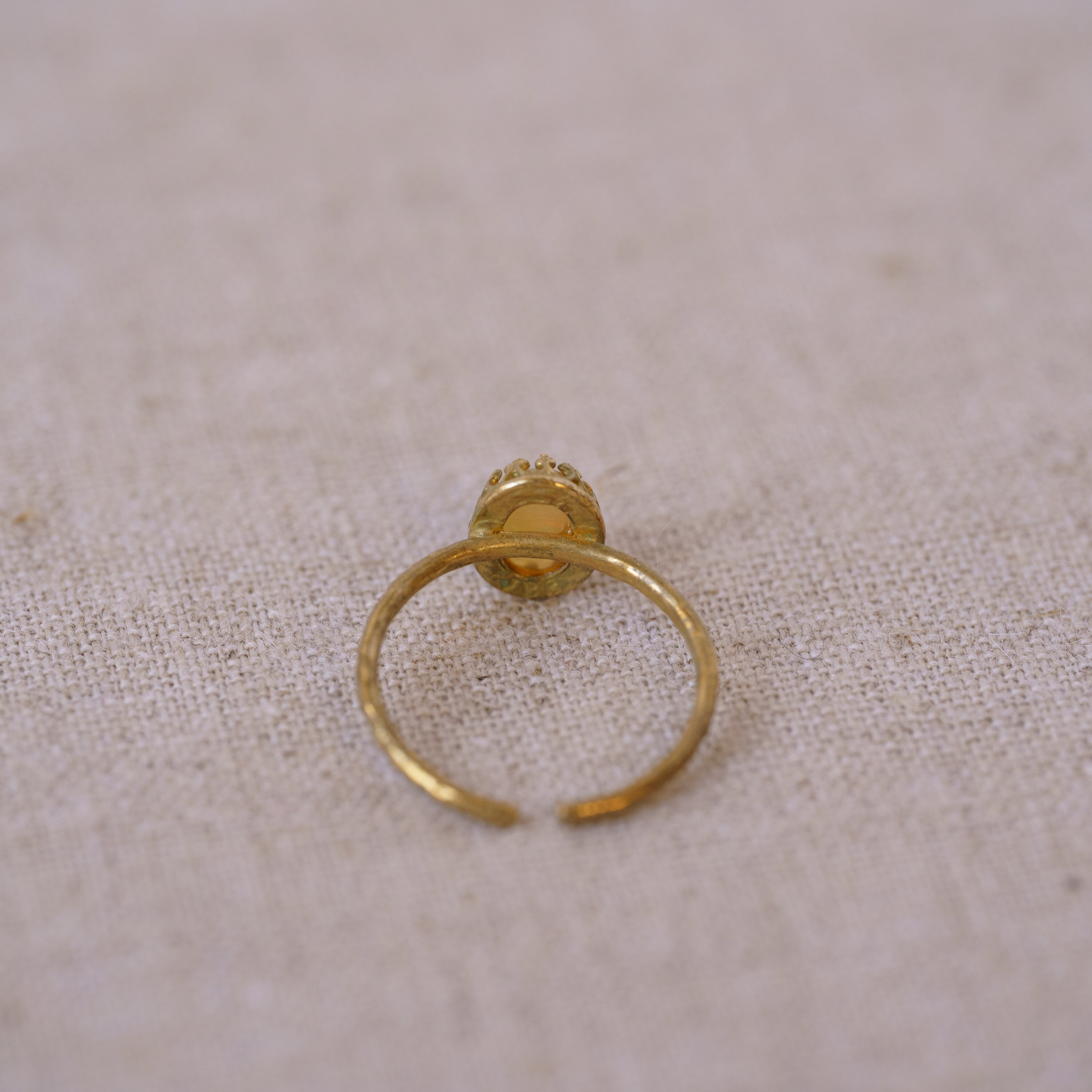 This vintage ring features soft-toned glass and delicate metalwork framing, creating a captivating and understated elegance. The matte texture and subtle nuances wrap your finger in refined sophistication. With its simple yet striking design, this ring seamlessly complements any outfit, elevating your style to the next level. A timeless, classic silhouette that is an essential piece for any jewelry collection, perfect for both everyday wear and special occasions.