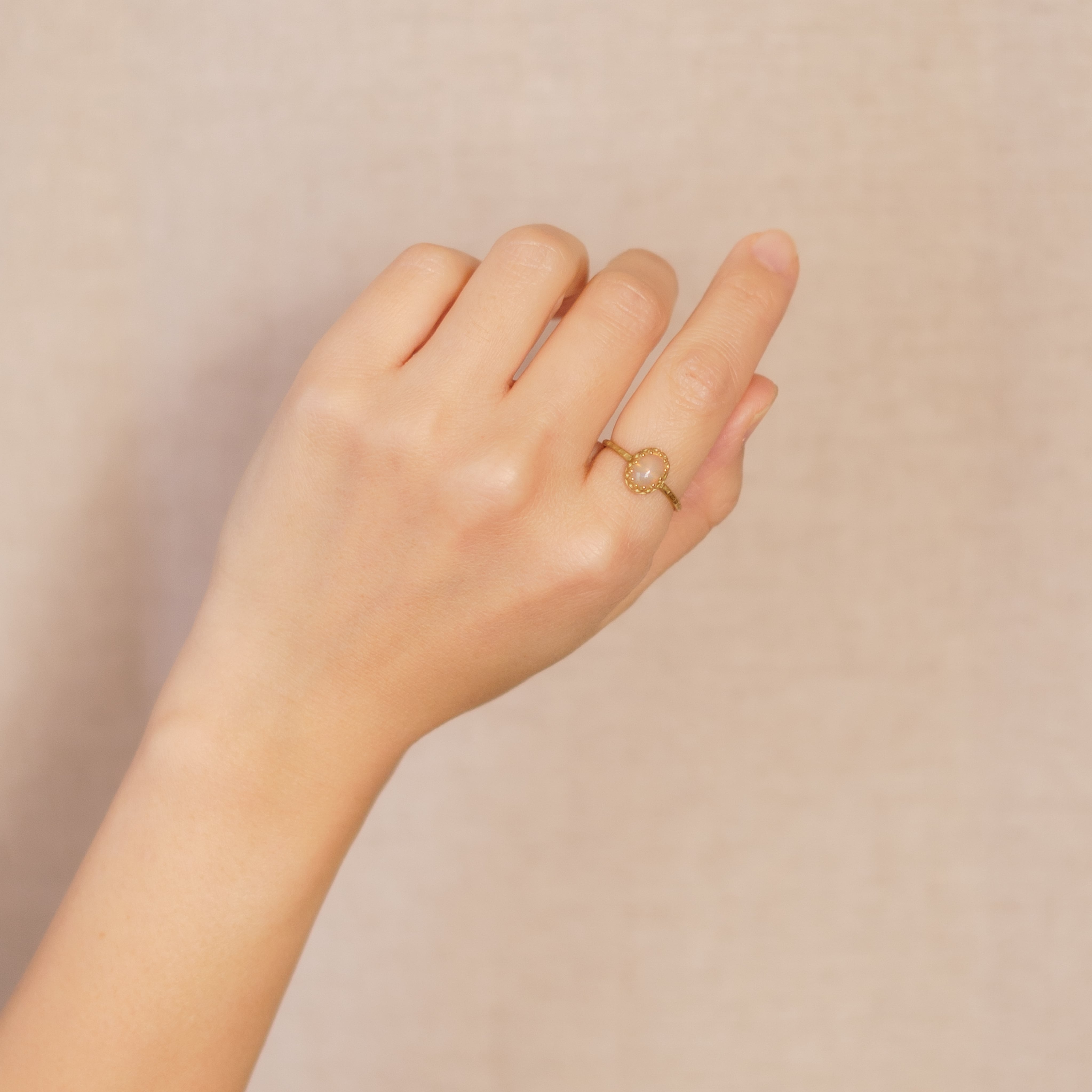 淡いトーンのガラスと、繊細なメタルワークのフレームが美しいヴィンテージリング。マットな質感と控えめなニュアンスで手元を優雅に包み込み、落ち着いたエレガンスを感じさせます。シンプルながらも存在感があり、どんな装いにもすっと馴染み、コーディネートに上品なアクセントを加えてくれます。クラシカルなデザインが、まさにジュエリーコレクションに欠かせないアイテムであり、日常使いにも特別な日にもぴったりです。