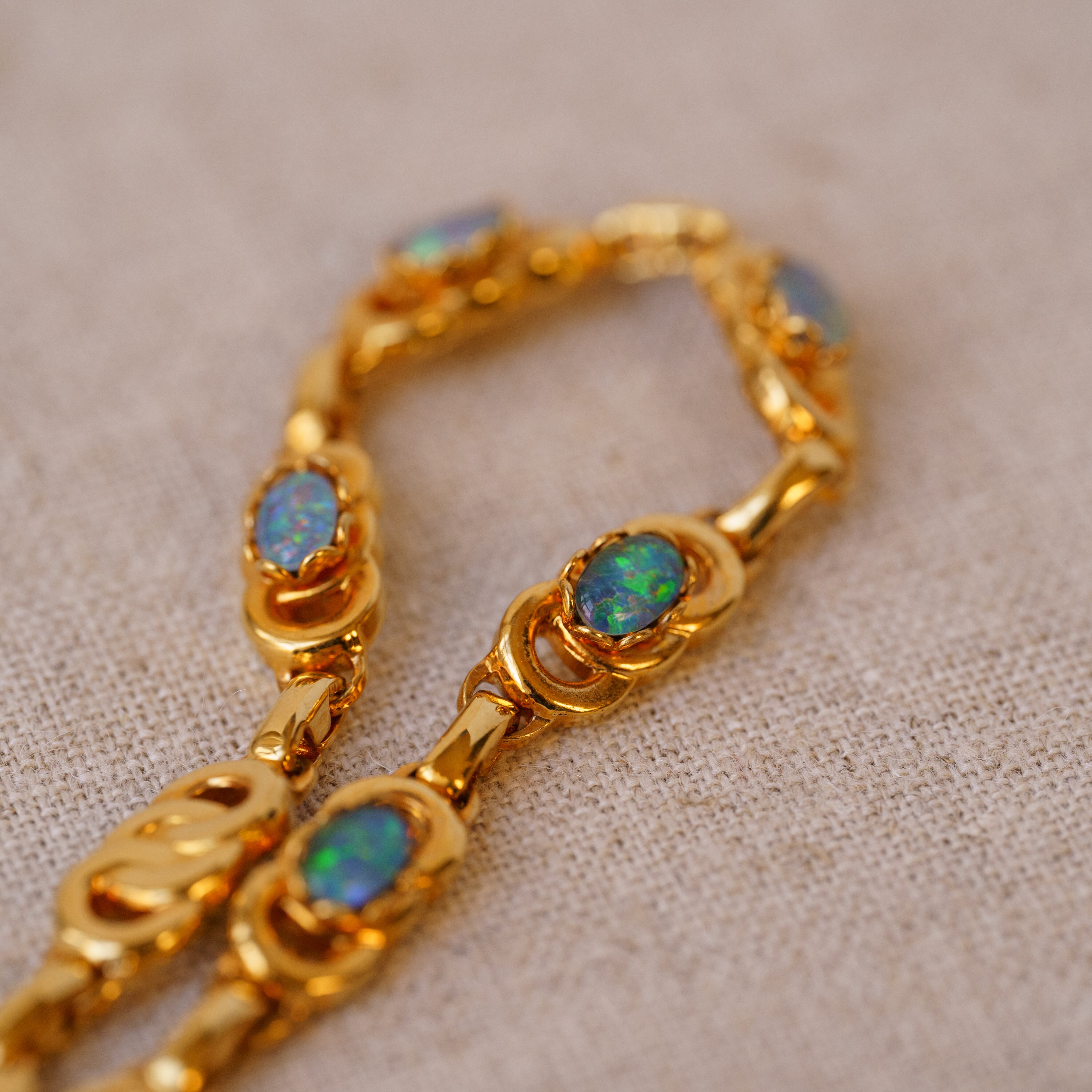 This vintage bracelet features luxurious Australian opals, a gemstone renowned worldwide for its unique play of color and depth. The opals’ shifting hues, changing with the angle of the light, are a captivating characteristic that sets them apart from other stones. The delicate metalwork of this bracelet enhances the opals’ elegance, giving it a refined radiance. The vintage gold adds a sense of weight and luxury, further emphasizing the beauty of the opals. This piece is simple yet bold, making it a versatile accessory that complements both everyday styles and special occasions.
