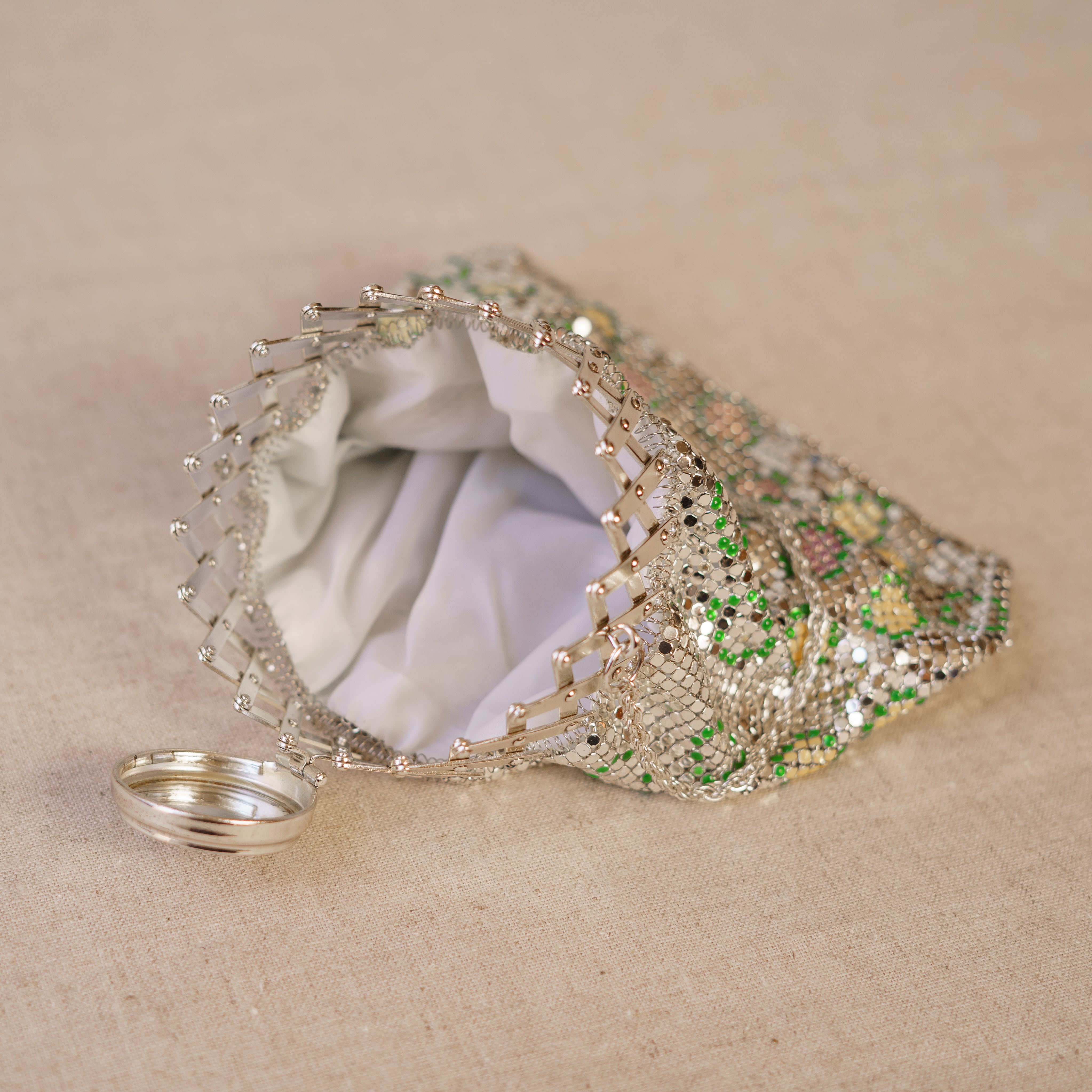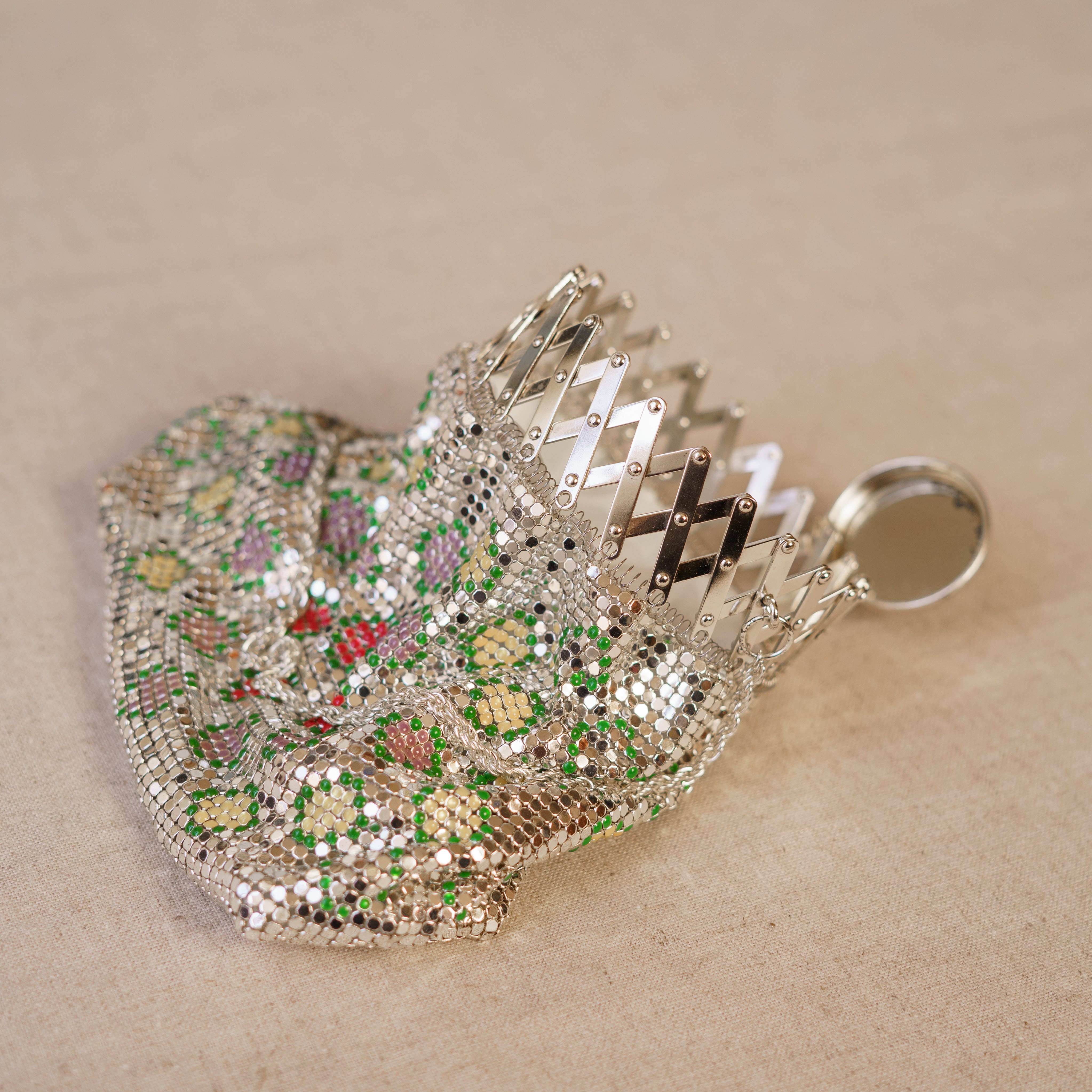 It’s perfect not only as a small accessory holder but also as a unique pouch to use for a lunch outing or a quick trip to the store, adding a touch of flair to your daily life with a piece that stands out. The silver metal mesh has a subtle abstract pattern with hints of color, which makes a striking impression. The fashion-forward feel of vintage silver adds a mode element, and the small size ensures it doesn’t overpower your look, making it perfect for year-round use.