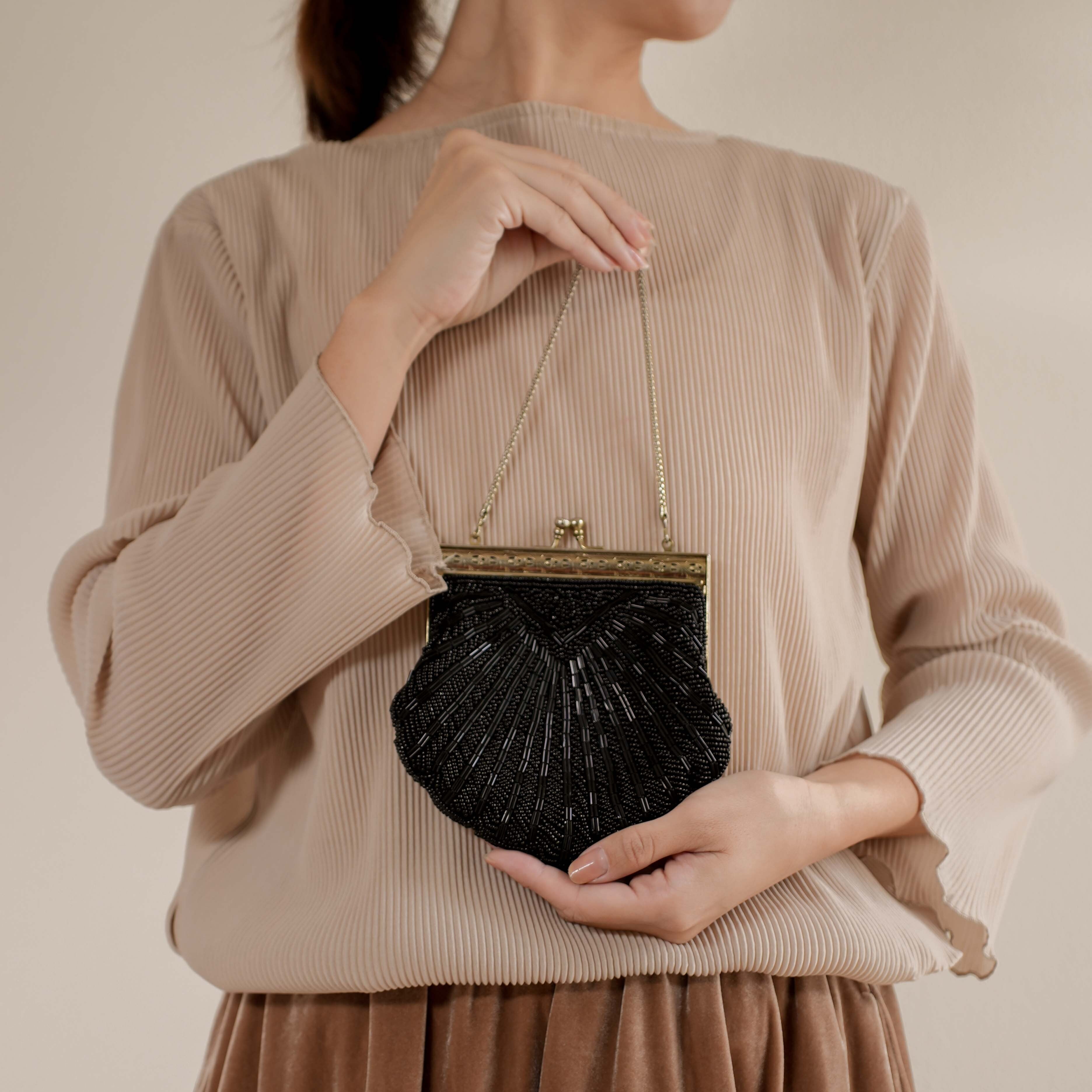 アール・ヌーヴォーデザインをシェルモチーフに落とし込んだ、エレガントで魅力的なヴィンテージハンドバッグ。やさしいきらめきが放たれ、目立ちすぎずに上品な雰囲気を演出します。丁寧なビーズワークが施されており、高級感と気品を漂わせるデザイン。ブラックトーンの落ち着いた色合いは、どんな装いにも合わせやすく、コーディネートに洗練されたアクセントを加えます。セカンドバッグとしても活躍し、ちょっとしたお出かけやパーティーシーンにぴったりなアイテムです。