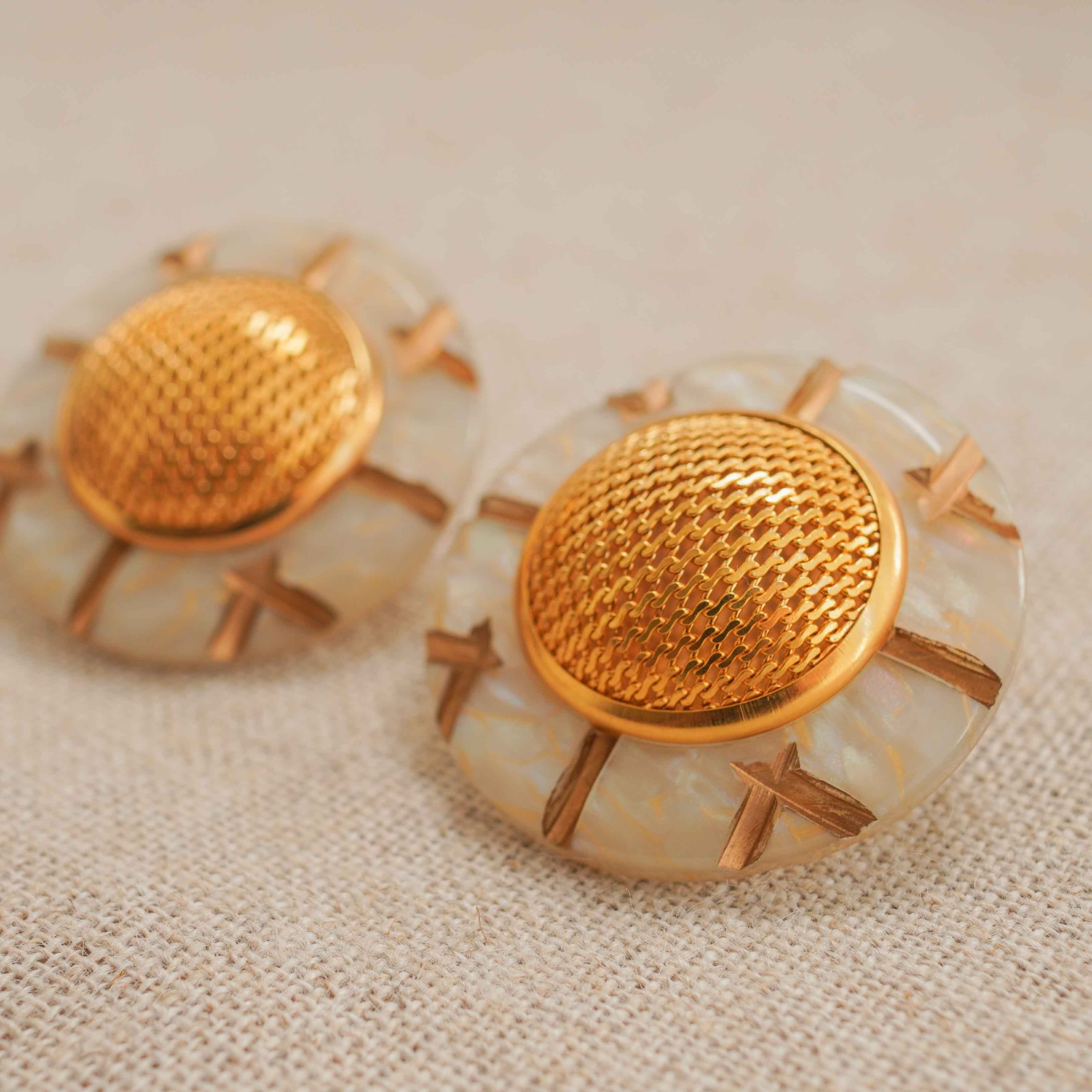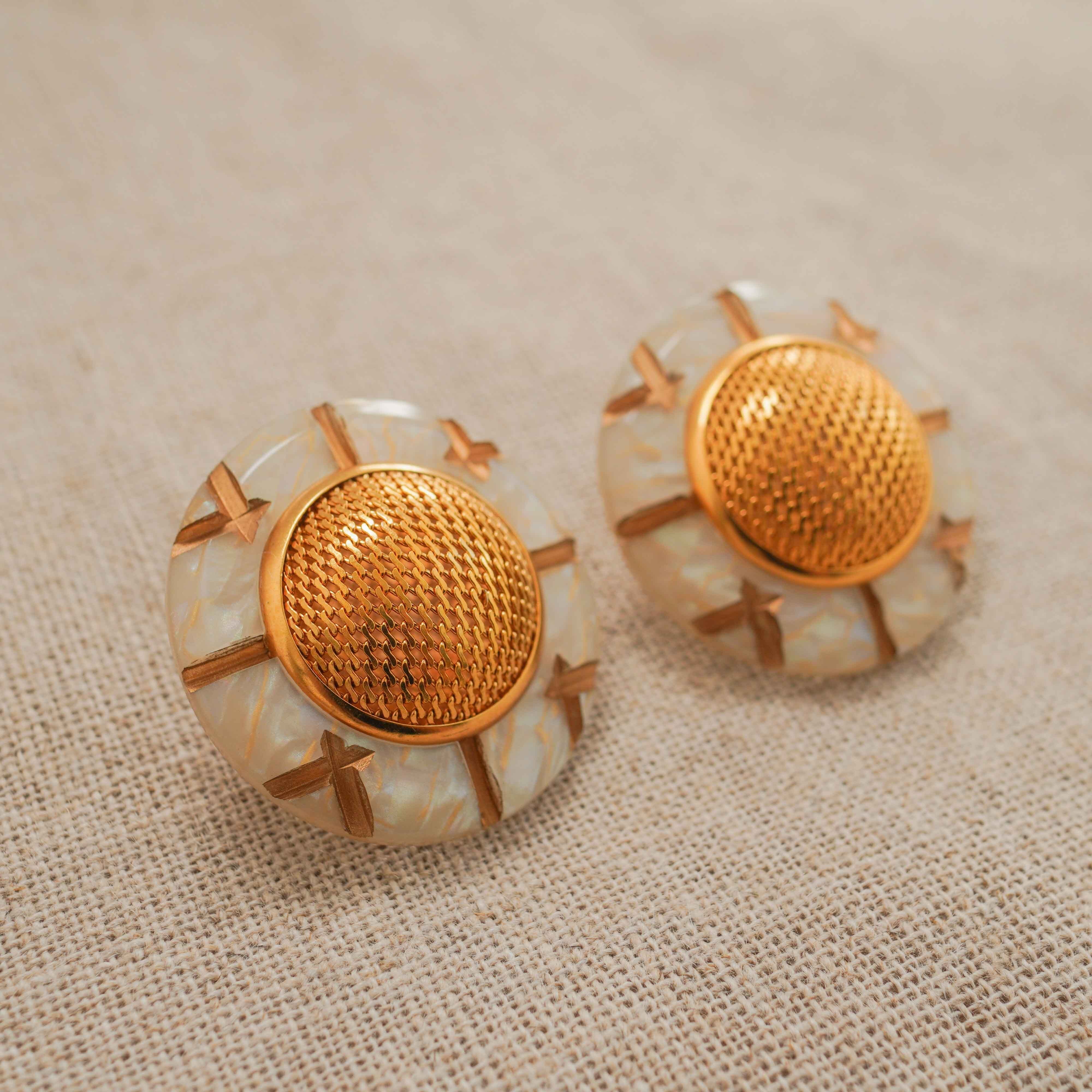 These vintage earrings catch the eye with their milky hue, exquisite marriage of vintage gold, and bold shape. The abstract motif exudes a sense of modernity, making them a perfect match for everything from simple tops to soft, flowing knits. A versatile piece that effortlessly complements any look, adding a touch of sophisticated elegance all year round.