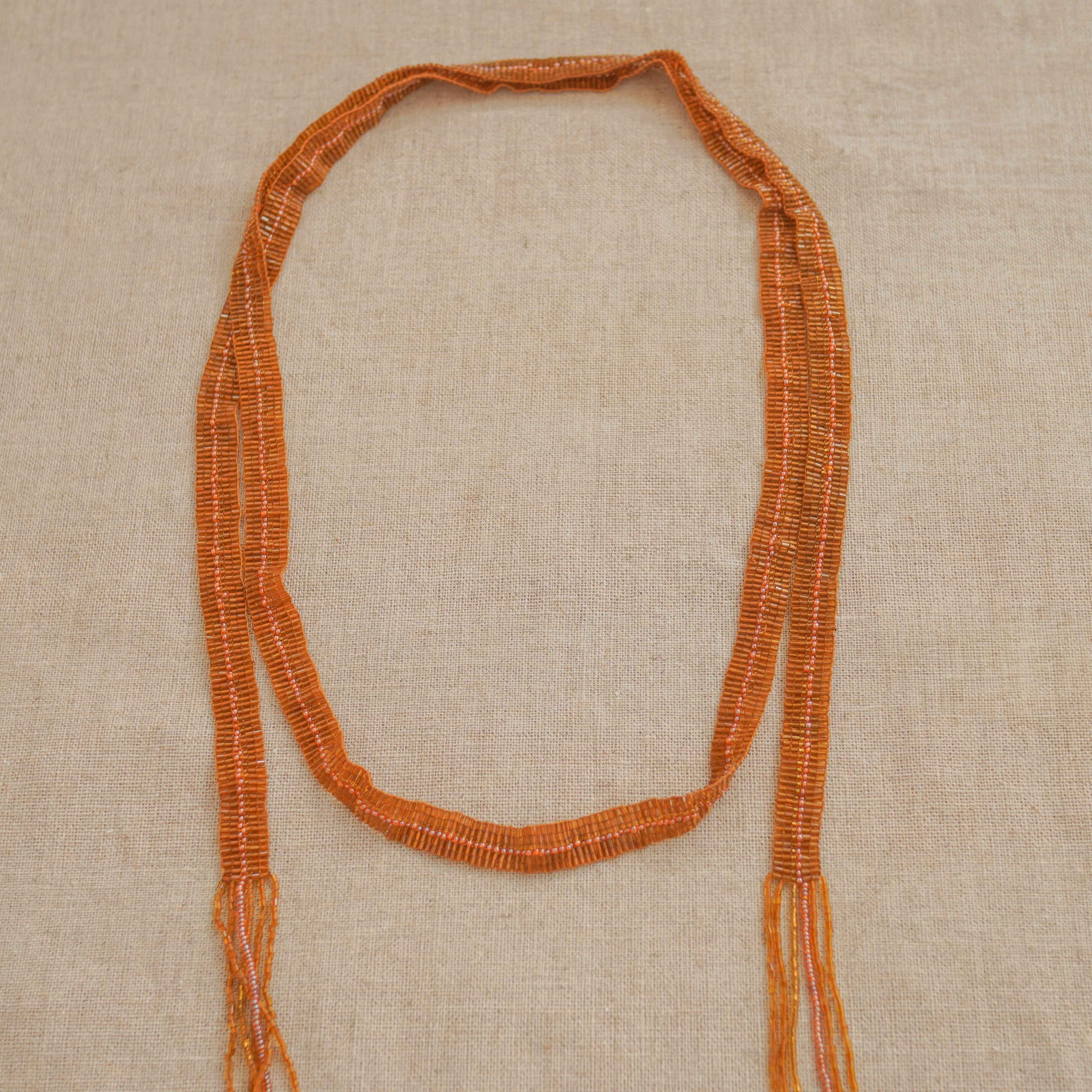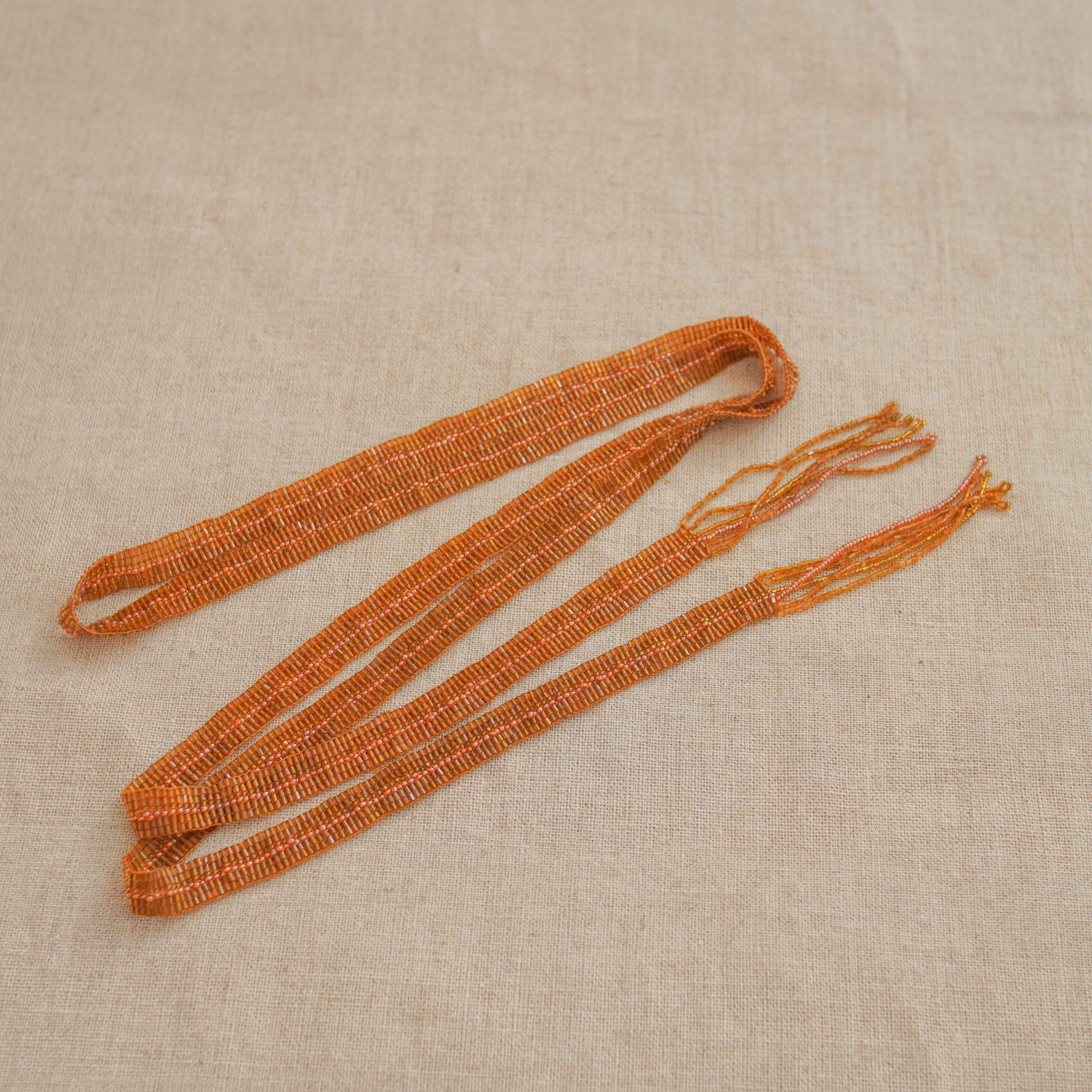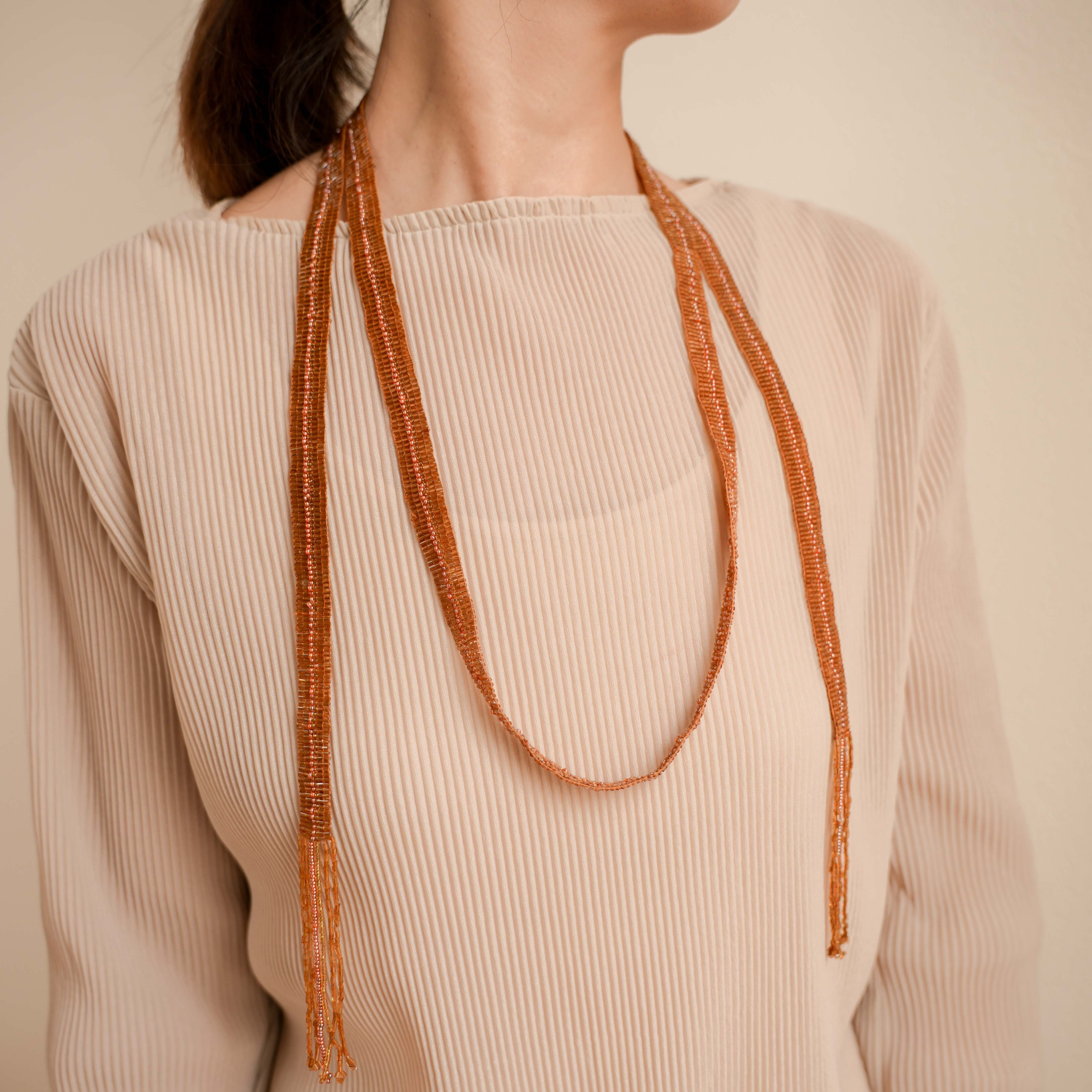 A vintage gold chain with a texture reminiscent of metal mesh, this versatile piece can be used as a necklace, bracelet, or belt. The ends are designed to hang down like tassels, adding a dynamic movement that brings just the right amount of tension and elegance. With its deep vintage gold finish and minimalist, handsome silhouette, this piece blends seamlessly into various outfits, offering a subtle accent.
