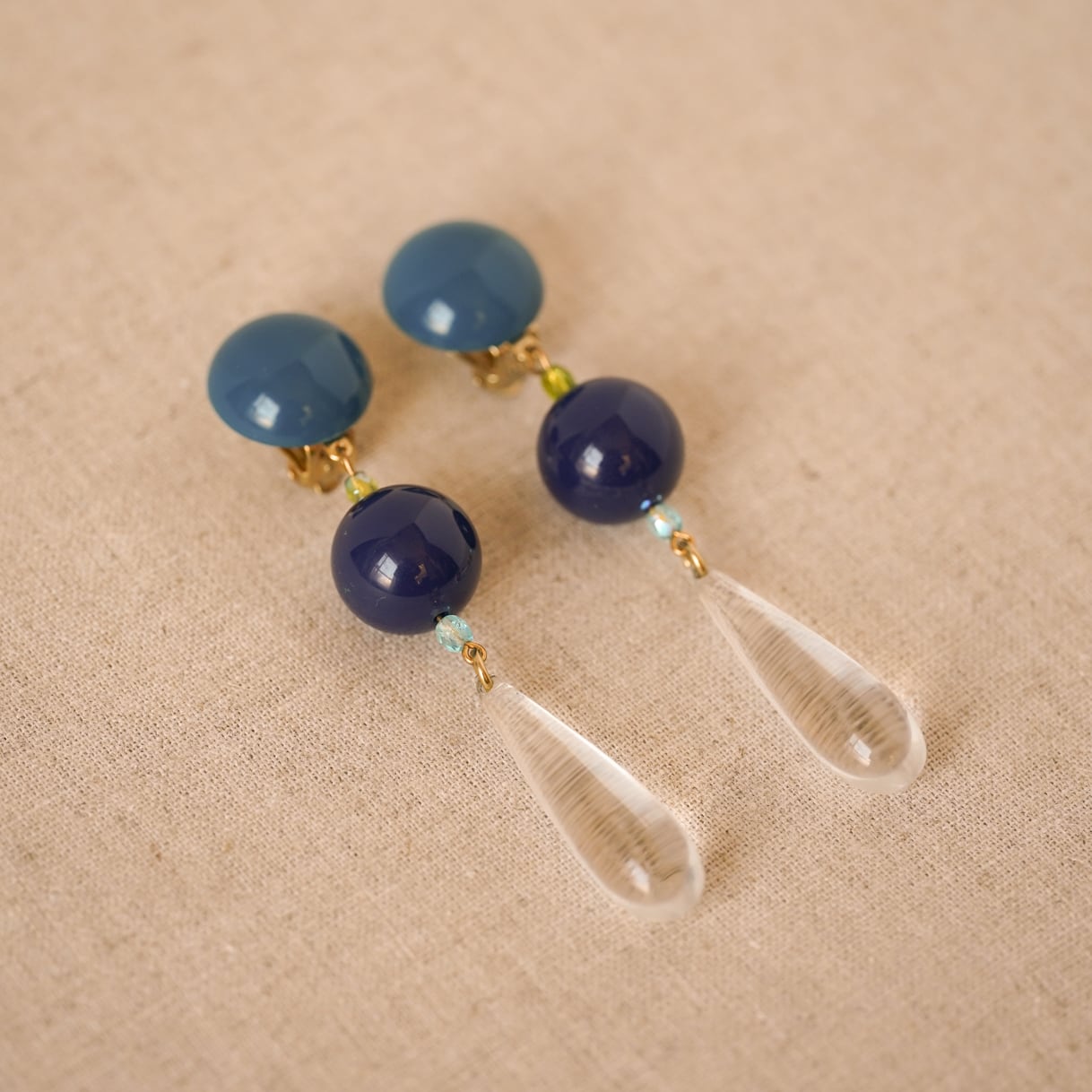 落ち着いたトーンとガラスチャームの透明感が特徴的なこのヴィンテージイヤリング。エナメルのマットな質感とガラスの透明感が絶妙に調和し、オトナかわいい雰囲気に仕上がっています。少し大振りですが、モードなシルエットとガラス素材が軽やかで洗練された印象を与えます。揺れ動くたびに、ガラスの透明感が光を反射し、顔まわりにエレガントな動きと美しさを添えます。シンプルでありながら存在感があり、コーディネートに上品なアクセントを加えてくれるアイテムです。