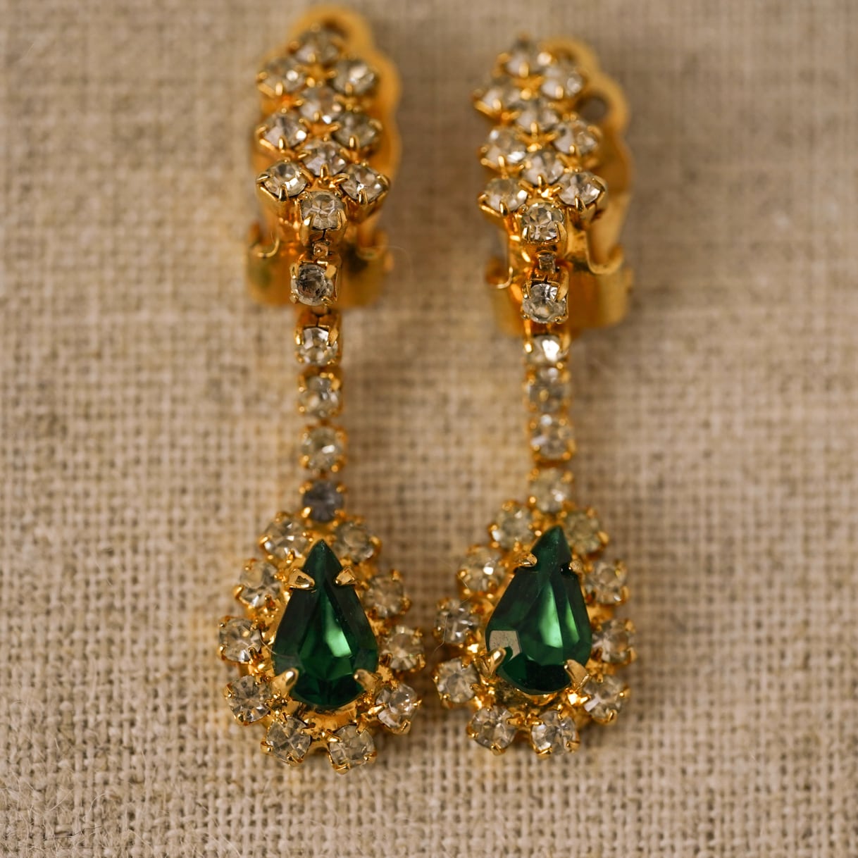 These elegant vintage earrings, featuring sparkling green glass details and pavé rhinestones, catch the eye with their delicate shimmer. The gentle gleam brightens the face and envelops it in a graceful, refined aura. With their tiny size, the sparkle of the rhinestones is subtly restrained, allowing them to seamlessly blend into a variety of looks. As they gently sway, they add a subtle movement to the ear, enhancing the overall charm. The vintage gold's weight and luxurious feel add sophistication, elevating the elegance of the design.