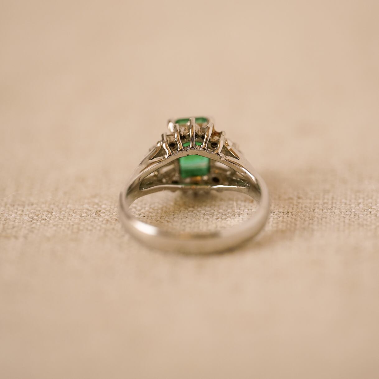 上質なシルバー925を使用したヴィンテージリング。センターに輝く透明感のあるグリーンストーン、その周りを取り巻くラインストーンパヴェの煌めきが目を引きます。美しいストーンの輝きが、手元をやさしいニュアンスで包み込み、シンプルながらも存在感を放つデザイン。しっかりとしたシャンクながら、なめらかな曲線で華奢なシルエットに仕上げられています。ヴィンテージシルバーならではの重圧感と高級感が漂い、手元を一層エレガントに引き立ててくれる一品です。