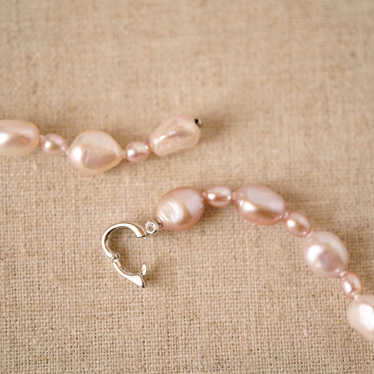 イビツなフォルムのバロックパールが並んだ、エッジのきかせた華やかさが魅力のラリアットネックレス。キャッチをお好みの位置に設定できるので、長さを自由に調整できるのもポイントです。ほんのりピンク色のバロックパールが、静ひつで優しい色合いでデコルテに気品を加え、装いに華やかさをプラスします。ラリエットネックレスはヴィンテージジュエリーでも珍しいスタイルですので、気になる方はぜひお見逃しなく。