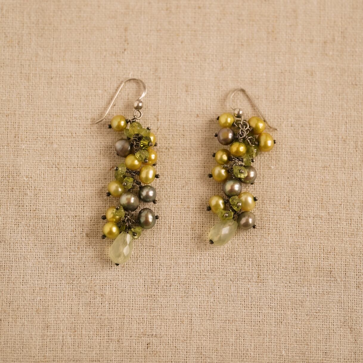 This pair of earrings, featuring clusters of Chartreuse Yellow and Smoky Gray freshwater pearls, creates a striking, mode-inspired design with a touch of elegance. The charming, bead-like texture forms an adorable silhouette, while the movement of the earrings as they sway adds a captivating allure. They envelop your face with a vibrant and graceful aura.