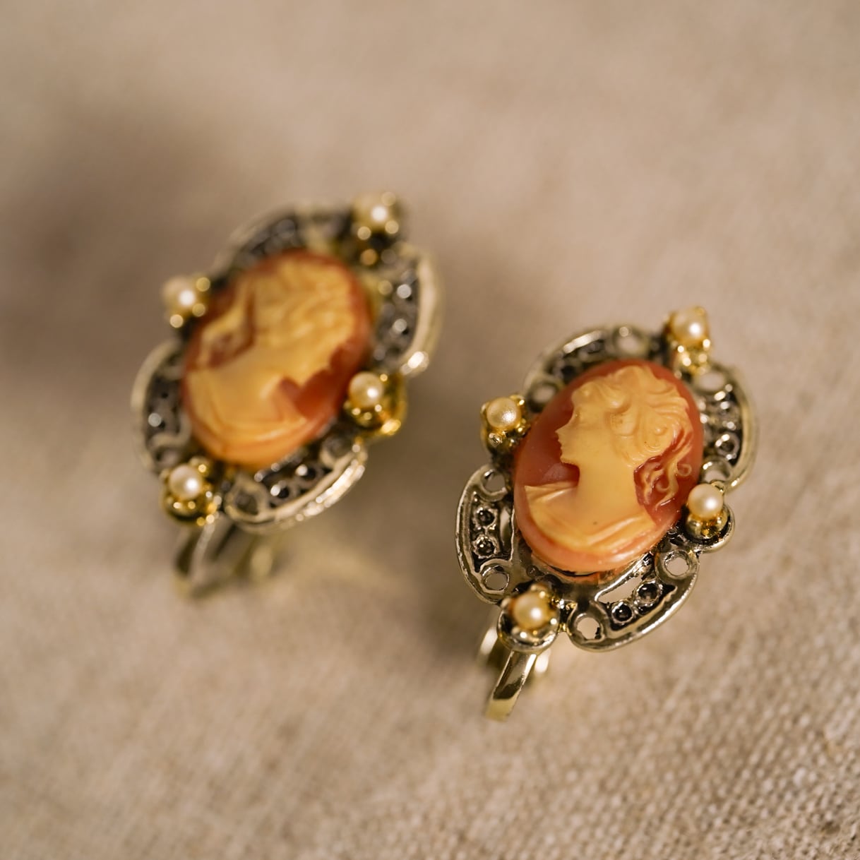 These vintage earrings feature a delicately hand-engraved cameo motif, carefully crafted to face one another when worn—a unique detail that adds to the charm of vintage jewelry. The intricate seed pearl details and the classical design of the frame beautifully complement the elegance of the cameo. This type of frame design is rare in cameo earrings, making these pieces a truly special find. Experience the timeless appeal of vintage jewelry at its finest.
