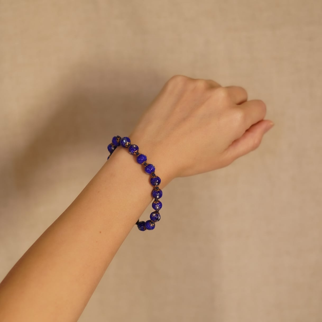A radiant dance of cobalt blue and golden light—this Venetian glass bracelet captures centuries of Italian artistry in every bead.
