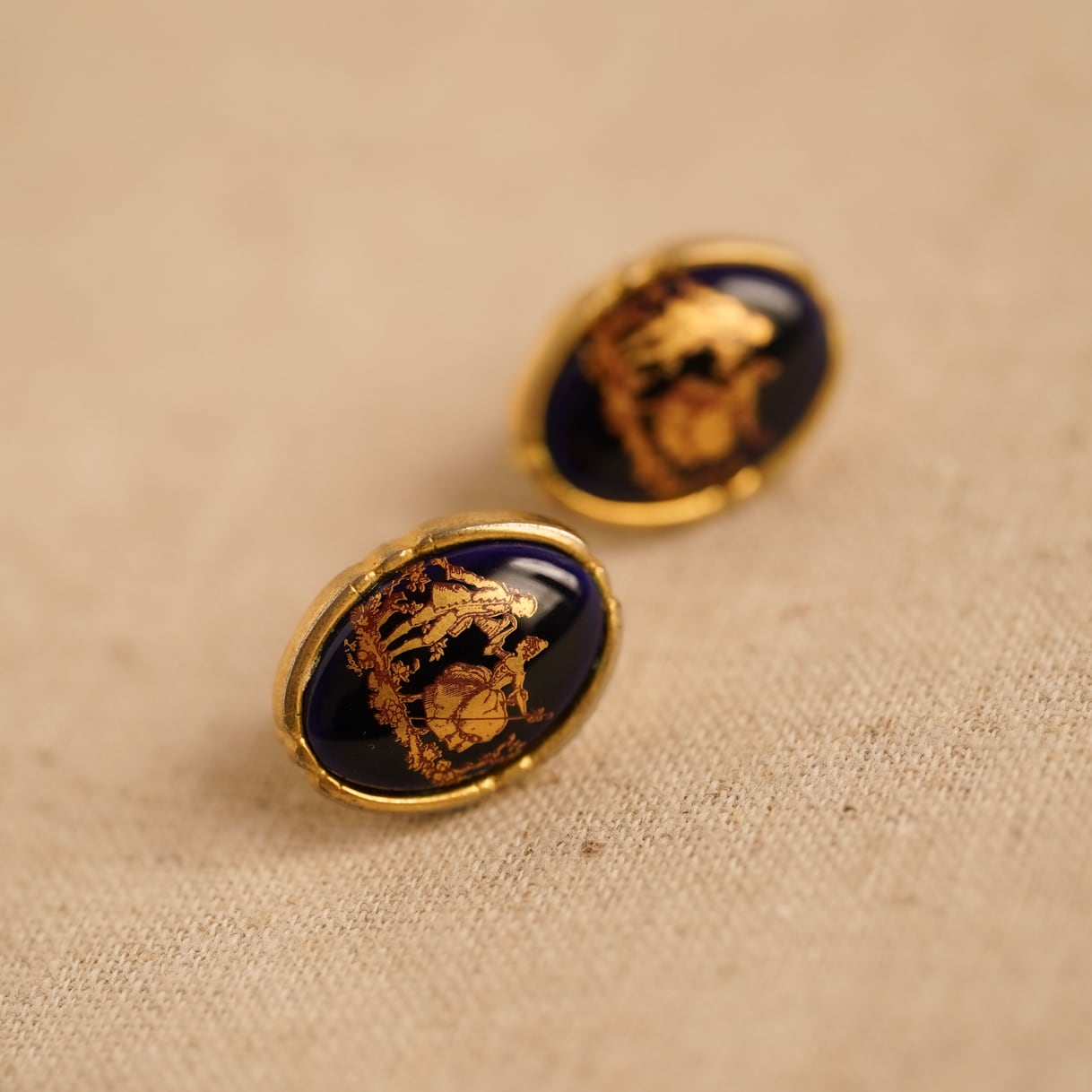 Vintage earrings by the prestigious French brand, Limoges. The cameo, featuring the portrait of two figures, is striking, with a royal blue and deep gold combination that exudes a regal atmosphere.
