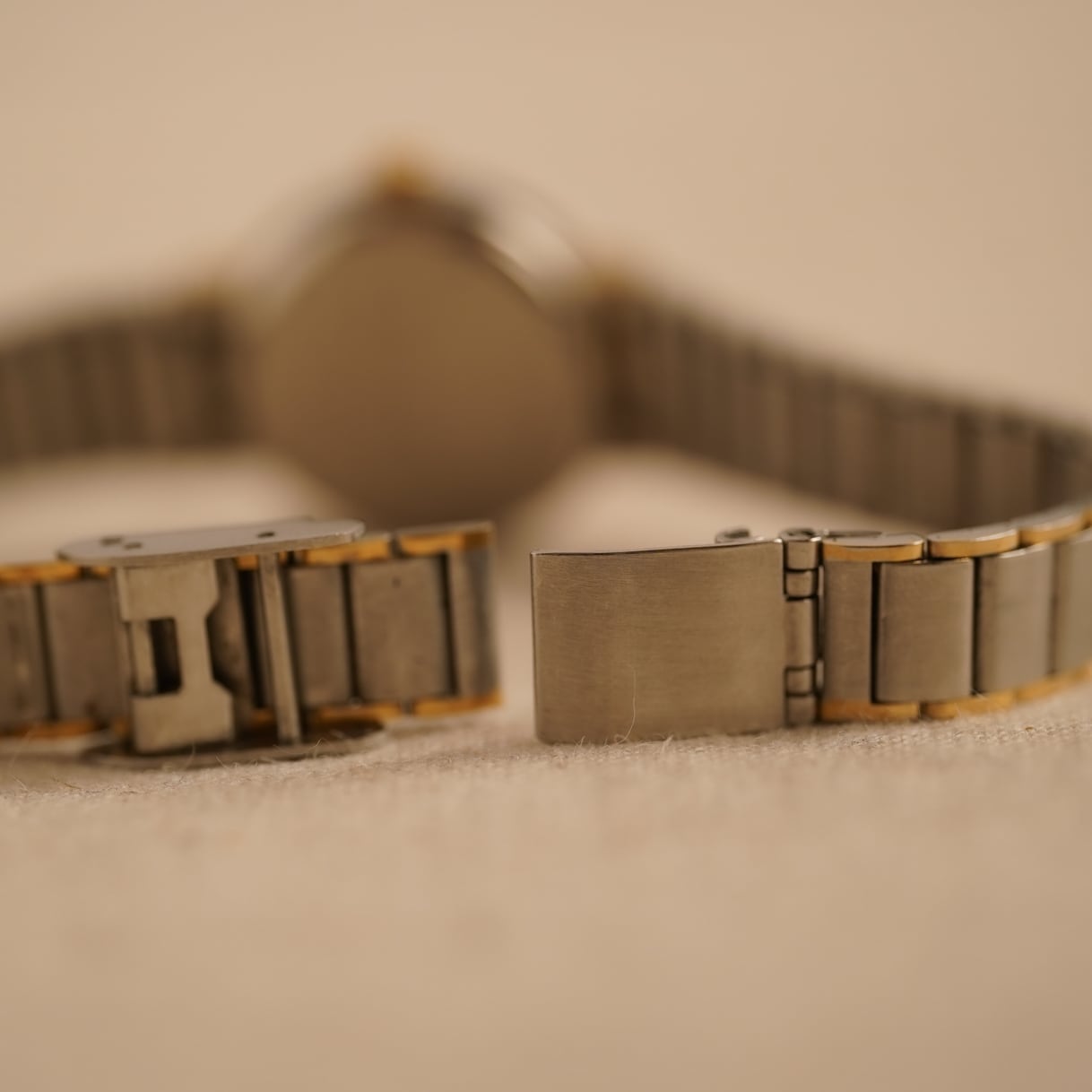 This vintage watch features a traditional white face, complemented by a two-tone metal frame and bracelet, offering a sharp and modern aesthetic. The lightweight silhouette adds sophistication to the wrist, while its versatile design pairs effortlessly with both gold and silver jewelry, allowing you to incorporate it into your ensemble like a bracelet.