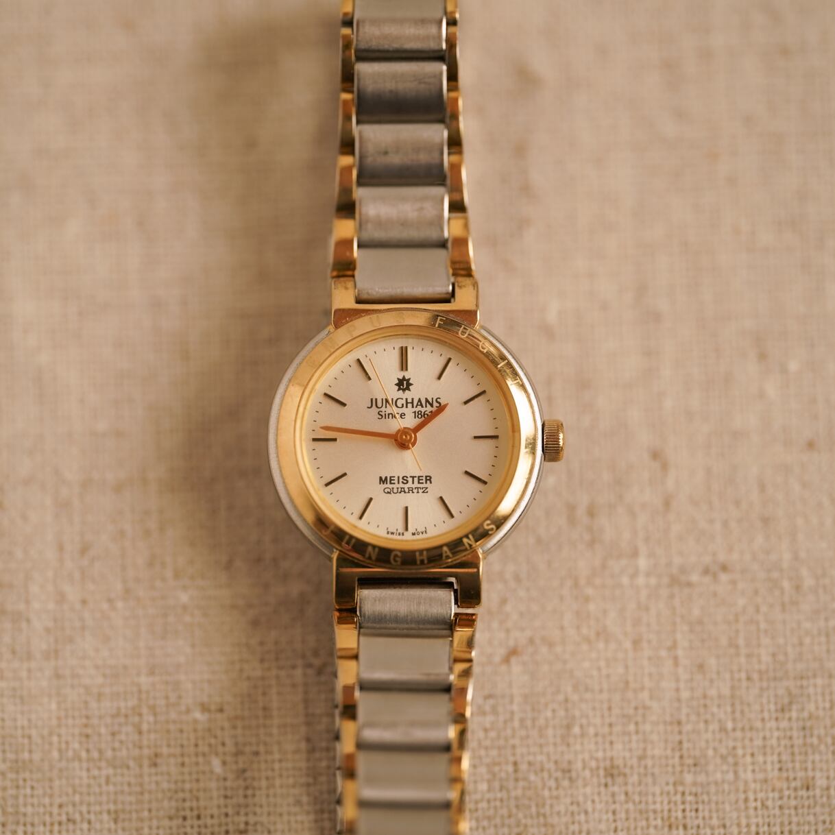 このヴィンテージウォッチは、トラッドなホワイトフェイスに、2トーンのメタルフレームとベルトが特徴的で、エッジの効いたモードなデザインが目を引きます。軽やかなシルエットは、手元に気品を与え、ゴールドとシルバーのジュエリーとも相性が良いので、ブレスレット感覚でコーディネートに取り入れて楽しめます。