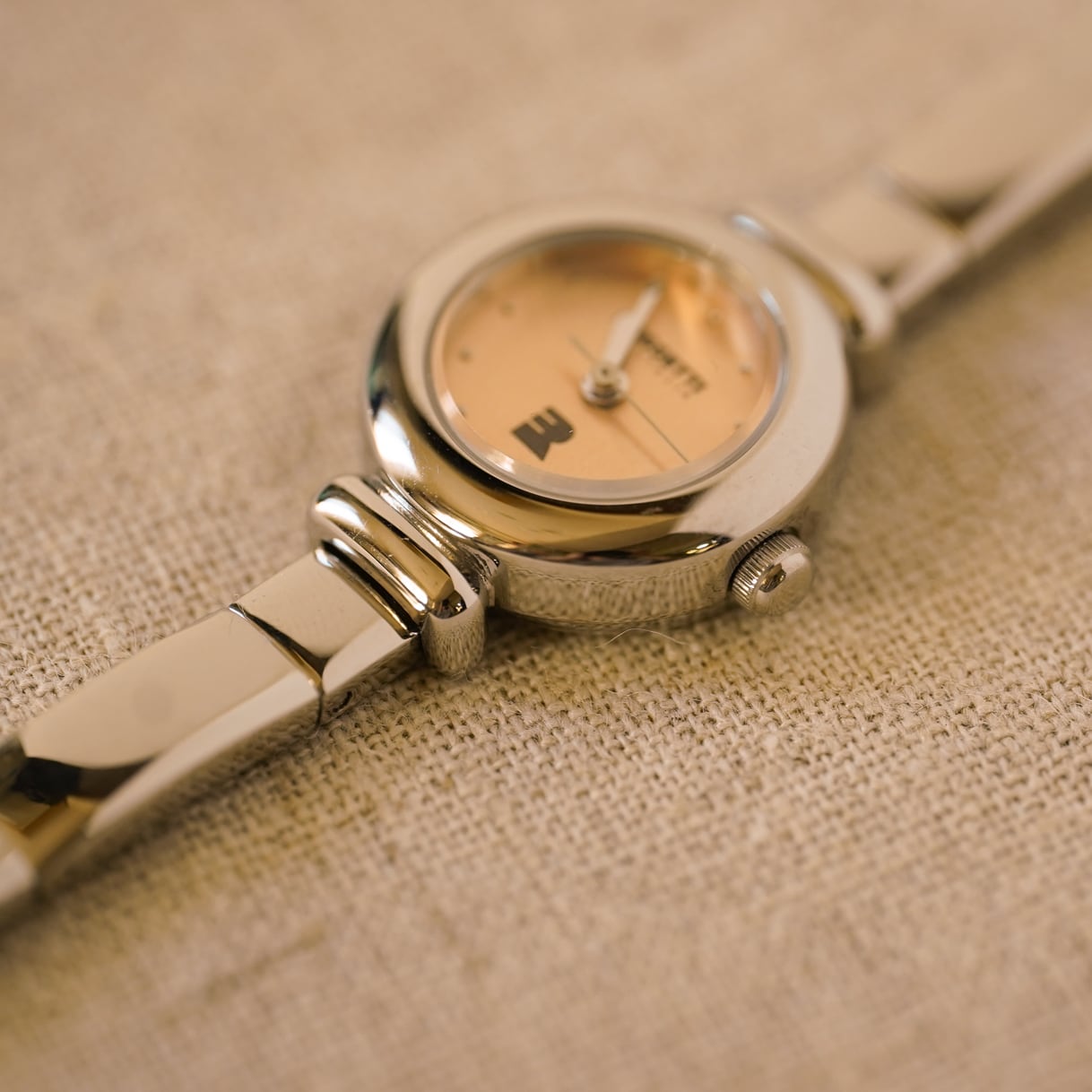 このRossettiのヴィンテージウォッチは、ウッドの温かみを感じさせるユニークなフェイスと、洗練されたマットシルバーのフレーム・ベルトが見事に調和し、エレガントな印象を与えます。ウッドの自然な風合いとシルバーのシンプルでハンサムなデザインが、モード感を引き立て、ブレスレット感覚で軽やかにお楽しみいただけます。ユニークでありながらも、上品で控えめな魅力を放つ、スタイルに華を添えてくれるヴィンテージウォッチです。