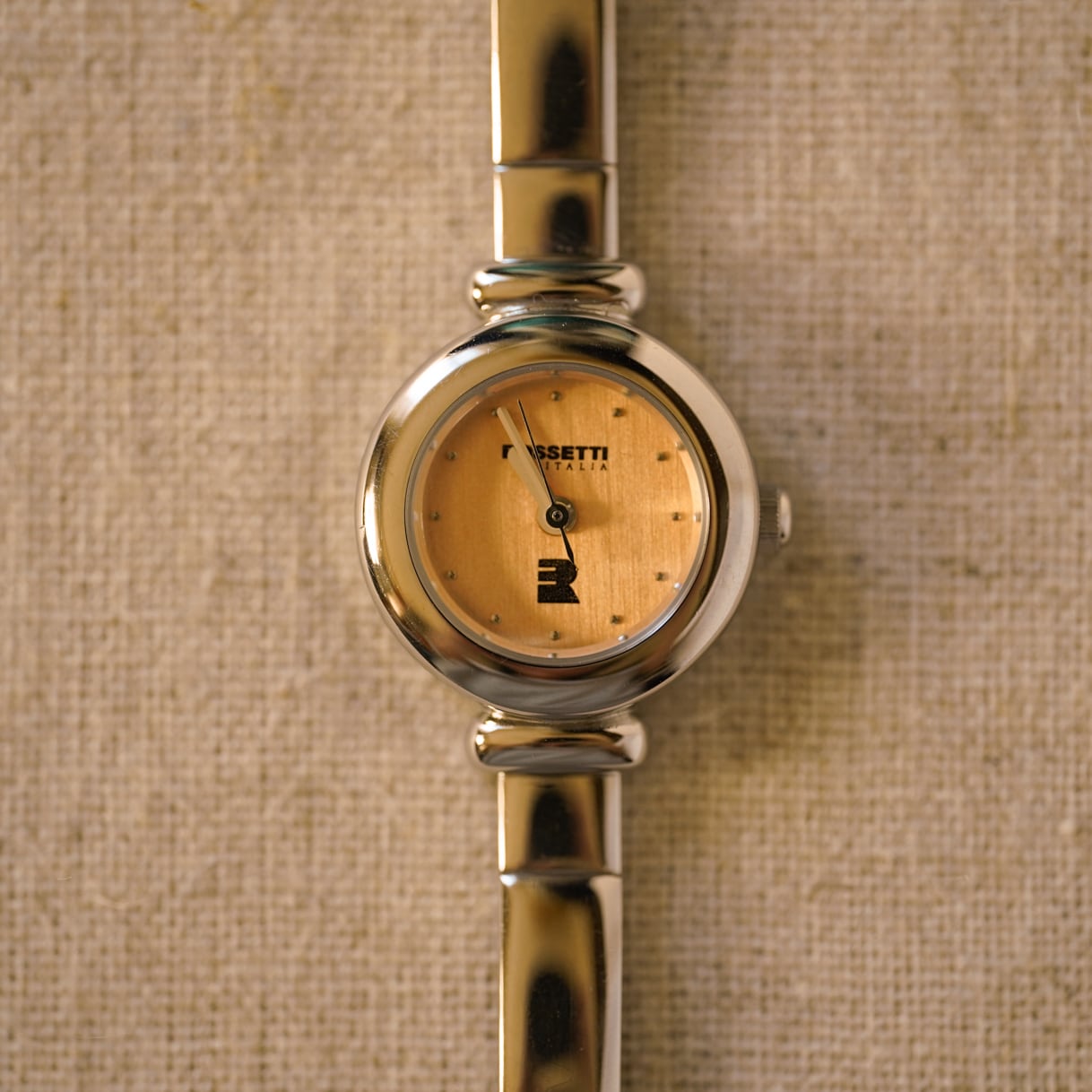 This vintage Rossetti watch features a unique wood dial that brings warmth to its design, complemented by a sleek matte silver frame and band, creating a stunning balance of elegance. The natural wood grain paired with the silver elements exudes modern sophistication, while the bracelet-style design offers effortless wearability. A piece that blends uniqueness with refined simplicity, this vintage watch adds a chic, understated charm to any style.