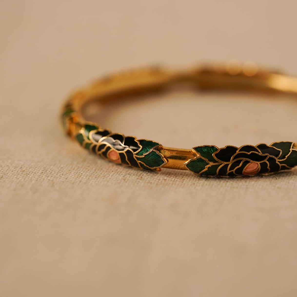 This vintage cloisonné bangle is a delicate and elegant piece that showcases the beauty of enamel work. Using the cloisonné technique, vibrant enamel colors are applied to spaces separated by fine metal wires, creating intricate designs that resemble a painting. The striking combination of blue, pink, and green tones harmonizes beautifully, with floral motifs embellishing the entire bangle.
