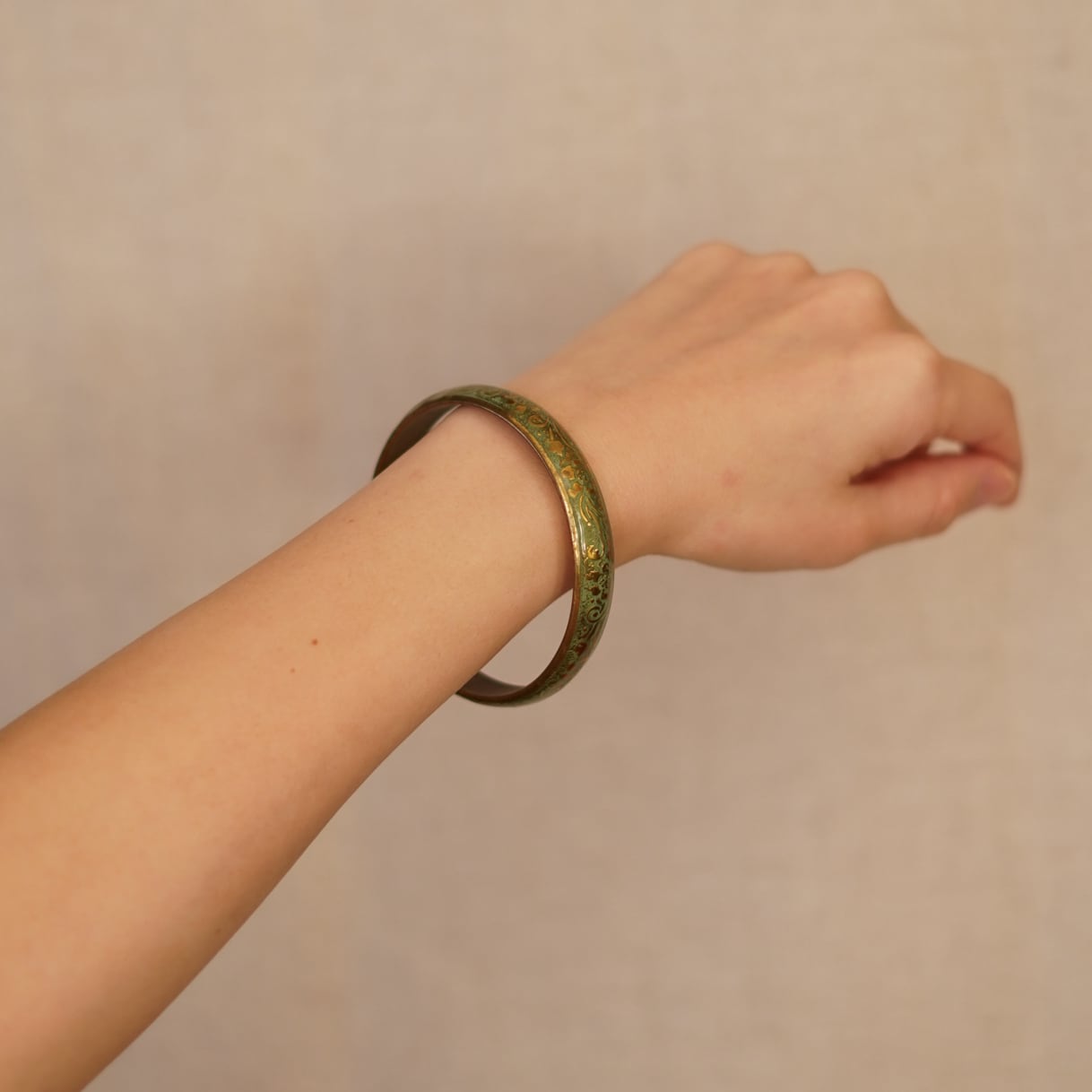 This vintage bangle features nature-inspired hand engravings that immediately capture attention. Its intricate craftsmanship brings warmth and depth to the design. The brass brown tones and matte moss green create a calming, bohemian vibe. With a relatively slim profile, it can be worn alone or stacked with other bangles for a chic look. A bangle is a key trend for this spring and summer, so why not incorporate this unique vintage piece into your wardrobe for an individual touch that stands out from the crowd?