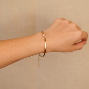 このヴィンテージブレスレットは、ゴールドメタルチューブが描く美しいモードなシルエットが特徴。シンプルながらも、パールのワンポイントデザインが加わることで、クラシカルでありながらも現代的な雰囲気を放っています。ミニマムで繊細なデザインが、手元を引き立て、上品さをプラスしてくれます。洗練されたデザインは、シンプルながら存在感のある仕上がりとなっており、コーディネートにほどよいアクセントを与えてくれる一品です。
