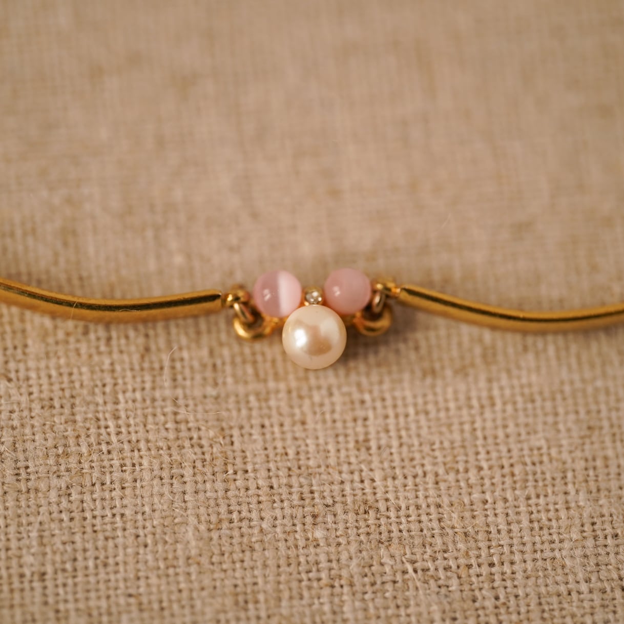 This vintage bracelet features a sleek gold metal tube creating a stylish silhouette. The addition of a pearl detail gives a classical touch, balancing the modern, urban design with a sense of refinement. The minimalist and delicate design enhances the wrist with sophistication, making it a versatile piece that subtly elevates any outfit. This piece is perfect for those who appreciate simple yet impactful accessories.