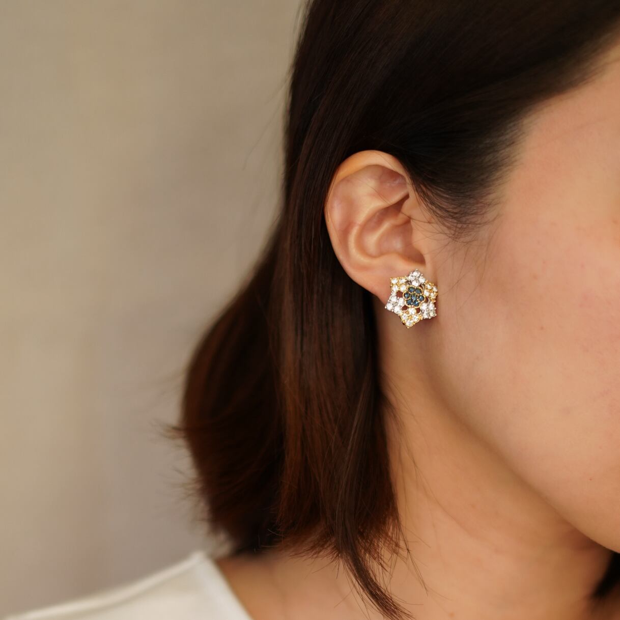 スターのようなフローラルモチーフが目をひく、ヴィンテージイヤリング。タイニーなサイズ感ながら、その細部にわたるディテールには圧倒されます。極小のラインストーンが、2トーンのメタルフレームに収められ、やさしいきらめきと深みのあるニュアンスが絶妙に調和したデザインです。控えめでありながら華やかなデザインは、フォーマルなシーンだけでなく、ちょっとしたお出かけにもぴったり。耳元にさりげなく馴染み、コーディネートにちょっとした緊張感を加えたい時に重宝します。