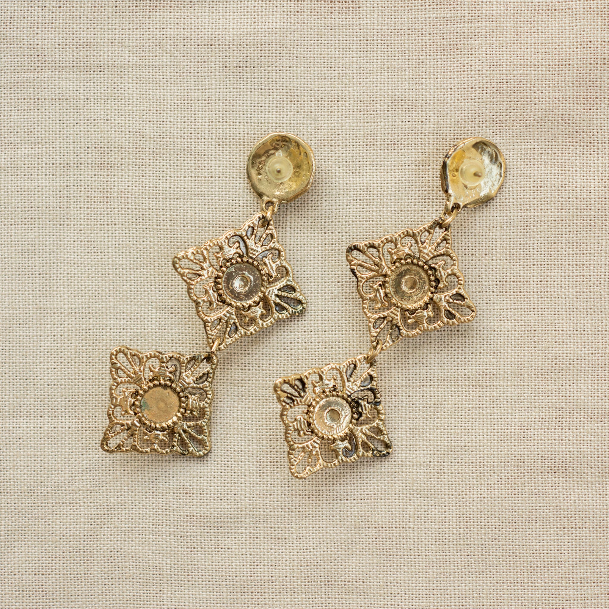 繊細なメタルレースワークとコスチュームパールの輝きが美しく調和した、ヴィンテージイヤリング。幾何学的なレースの透かし模様がアートピースのような印象を与え、ボヘミアンなニュアンスとクラシカルな気品が共存するデザインです。二連になったスクエアモチーフが顔まわりで優雅に揺れ、華やかさの中に洗練された軽やかさを添えます。やや大ぶりながらも、レースワークの繊細さがほどよい抜け感を生み、バランスの取れたエレガントなスタイルに。時を超えて愛されるヴィンテージの魅力が詰まった一品です。