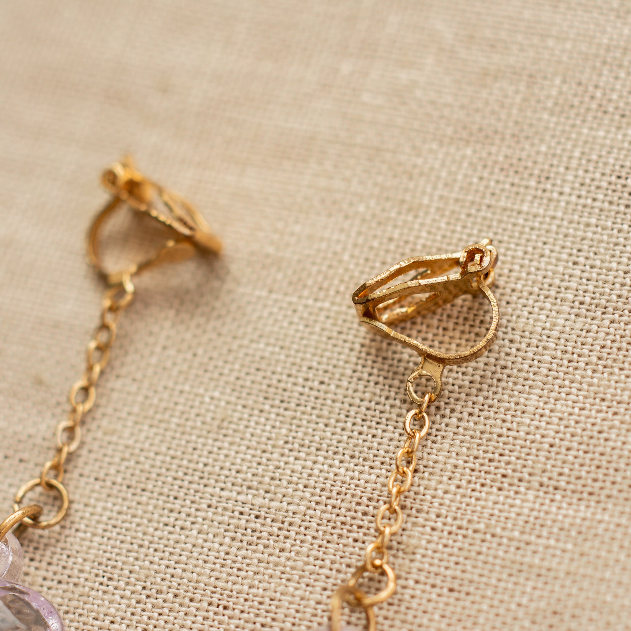 多面的にカットされたガラスハートチャームが、まるで宝石のように輝くヴィンテージイヤリング。華奢なチェーンから揺れ下がるハートが、愛らしさを引き立て、顔まわりに絶妙な緊張感をプラスします。ガラスから反射されるやわらかな光が、顔まわりを明るく照らし、シンプルでありながら華やかな印象を与えます。タイニーなサイズ感が、控えめな気品を持ちながらも、さりげなくコーディネートにきらめきを加えてくれるアイテムです。