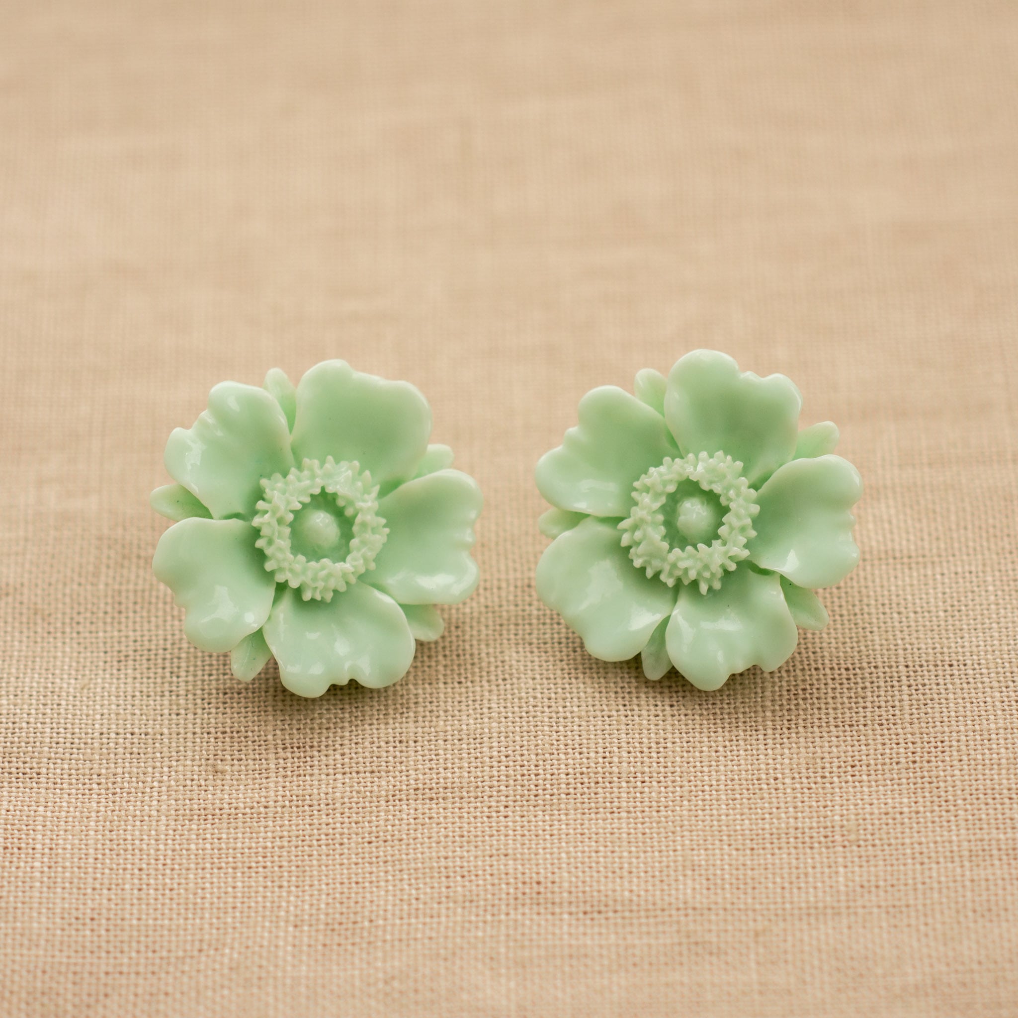 A charming pair of vintage earrings featuring intricately engraved mint-green floral motifs. The soft, natural green tone gently brightens the face, adding a subtle yet refined touch of elegance. Though slightly bold in size, the loosely detailed floral design tempers any sweetness, lending a polished and effortlessly chic appeal. The harmonious balance of intricate detailing and muted color allows these earrings to complement both sophisticated and casual ensembles seamlessly. A timeless piece that adds a fresh accent to any look.
