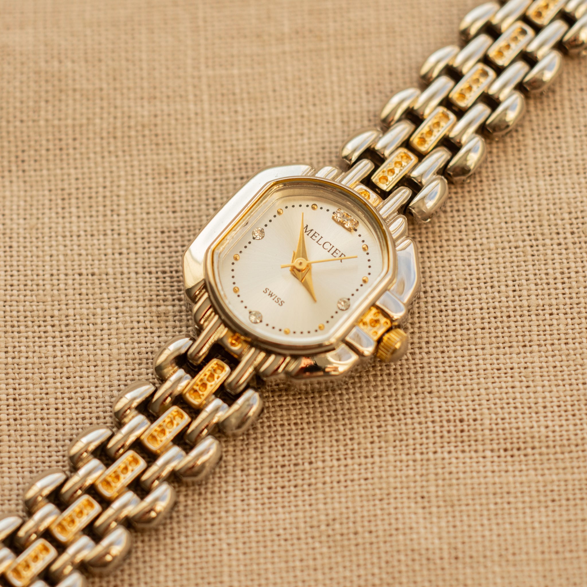 This vintage Mercier watch features a modern octagon-shaped case, paired with a two-tone vintage metal finish that makes a bold statement. Delicate gemstones embellish the dial, offering a subtle yet sophisticated shine. The beautiful, blade-like bracelet design resembles that of a bangle, allowing the watch to be worn like jewelry. This piece adds elegance and refinement to any look, effortlessly blending into various styles. Whether for formal events or everyday wear, this watch exudes both grace and glamour.