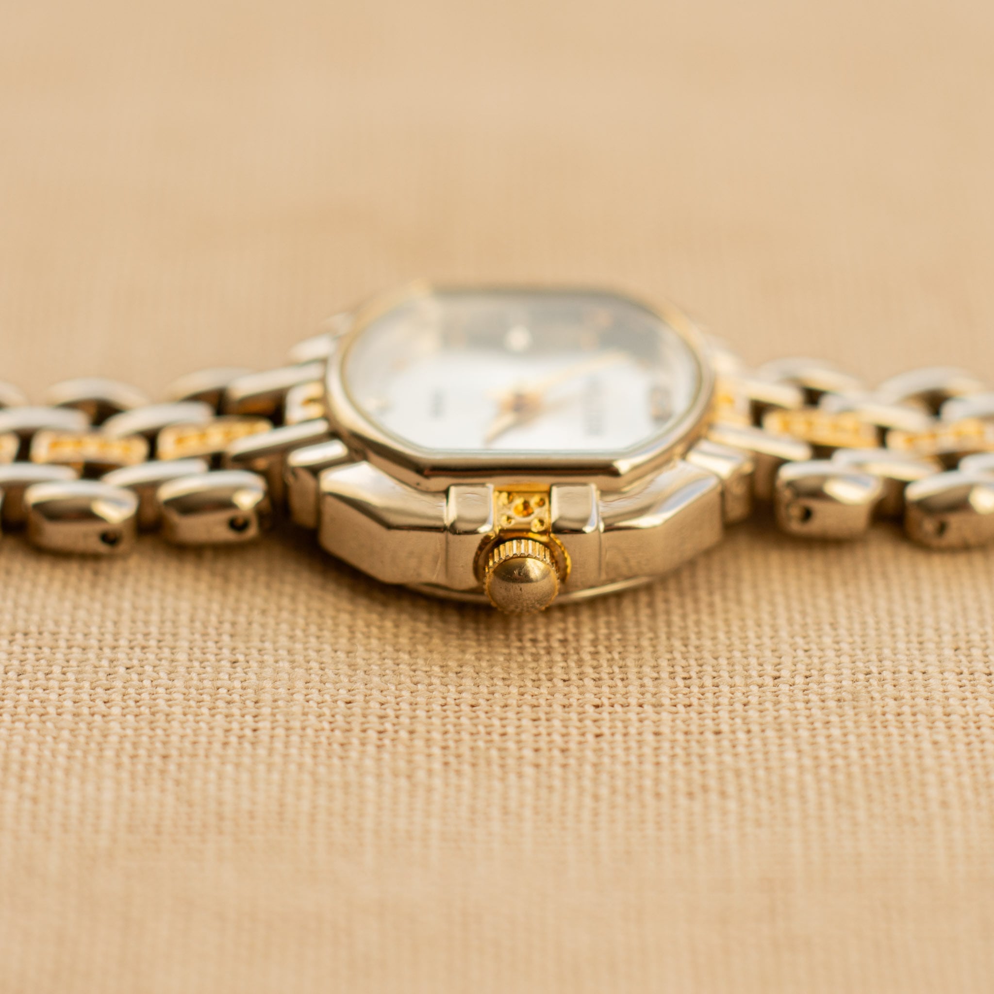 このヴィンテージウォッチは、モダンなオクタゴンシルエットと、2トーンのヴィンテージメタルが美しく調和し、目を引きます。繊細な天然石が装飾されたフェイスは、シンプルでありながらも、存在感を放ちます。美しいブレード状のベルトは、ブレスレットのように腕を飾り、ジュエリー感覚でお楽しみいただけます。気品とエレガンスを自然に引き立て、どんなコーディネートにもさりげなく溶け込みます。どのシーンでも華やかさと品を兼ね備えた、この時計は一度手にすると手放せないアイテムになるでしょう。