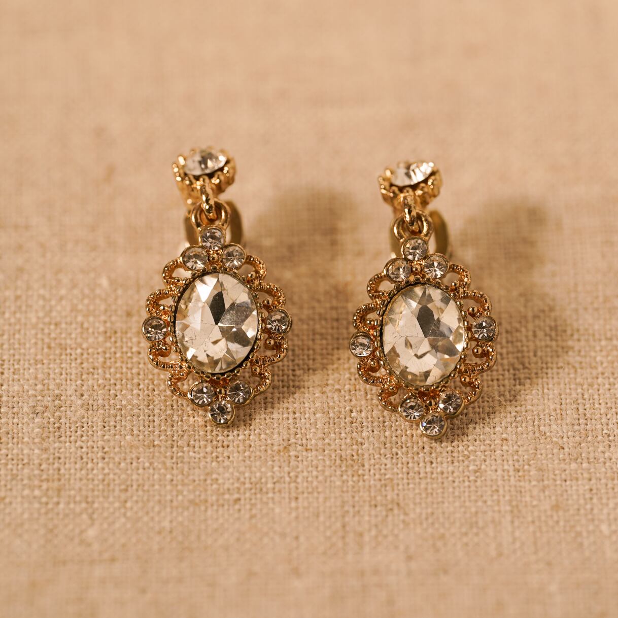 A pair of vintage earrings reminiscent of antique mirrors found in royal palaces, exuding timeless elegance and sophistication. Delicate metal lace frames the central oval-cut stone, while tiny rhinestones add a refined sparkle. The gentle shimmer catches the light with every movement, brightening the face with a soft, luminous glow.