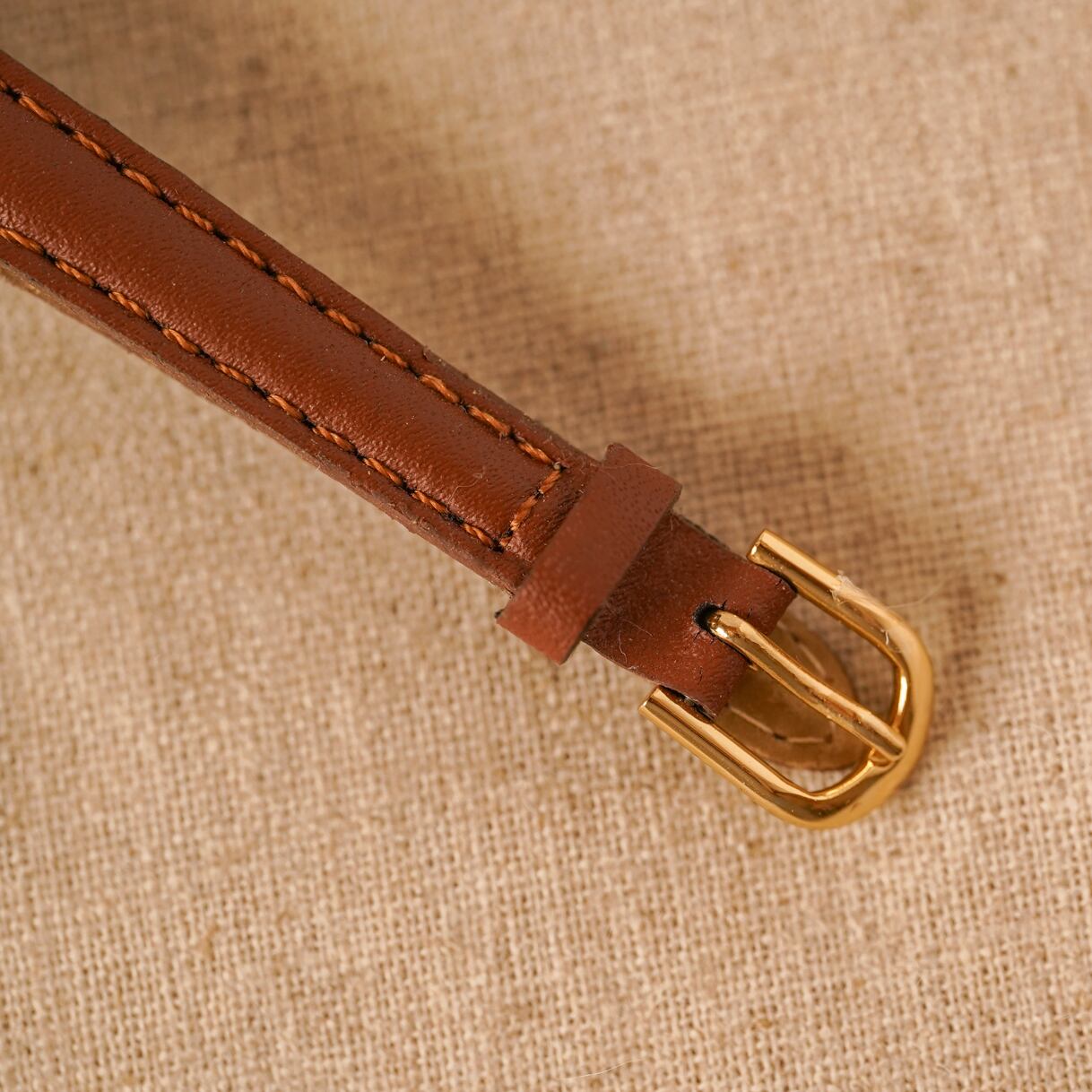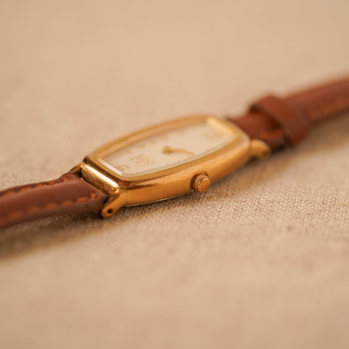 Styling tip: In spring and summer, pair it with an ivory or beige linen shirt or a simple cotton dress for a natural look that complements the watch’s classic design. Layering it with delicate gold jewelry enhances the effortless elegance. In autumn and winter, wear it with a dark brown or navy turtleneck knit or a classic wool coat to highlight the refined glow of the vintage gold frame in a sophisticated way. A seasonless timepiece that adds polished elegance to any outfit.