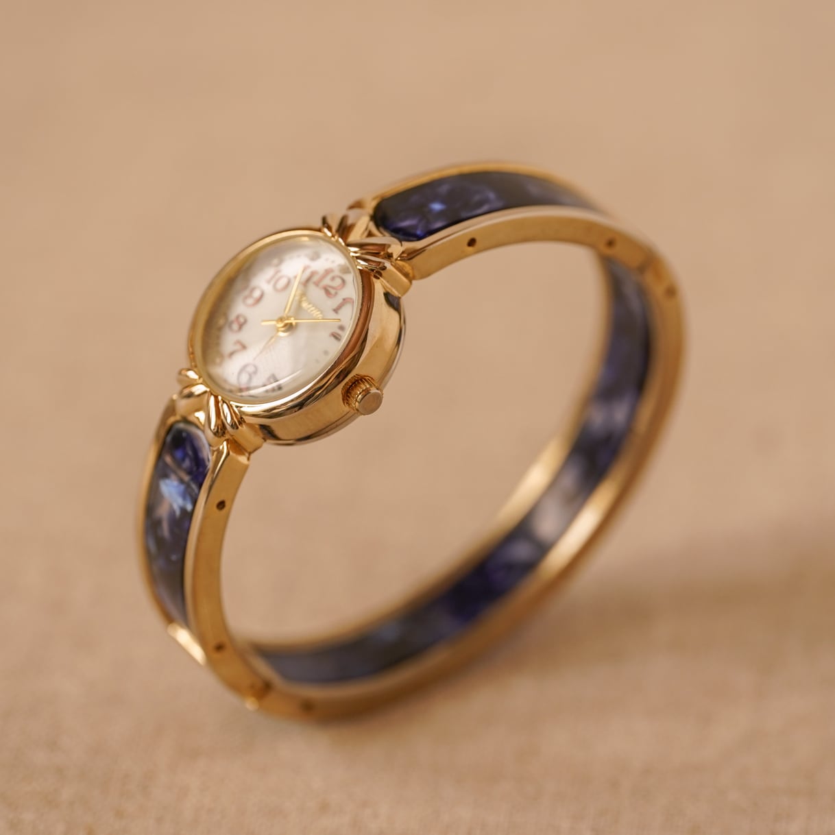 淡いブルーエナメルが美しく輝く、ヴィンテージバングルウォッチ。深みのあるブルートーンとヴィンテージゴールドの重厚な輝きが調和し、手元に気品と洗練されたクラシカルな雰囲気をもたらします。バングルスタイルのデザインがジュエリーのような感覚で身に着けられ、時計としての機能性だけでなく、装飾性の高さも魅力のひとつ。澄んだブルーのエナメルが程よいアクセントとなり、フォーマルなシーンはもちろん、カジュアルなお出かけにもさりげない気品を添えてくれる一本です。