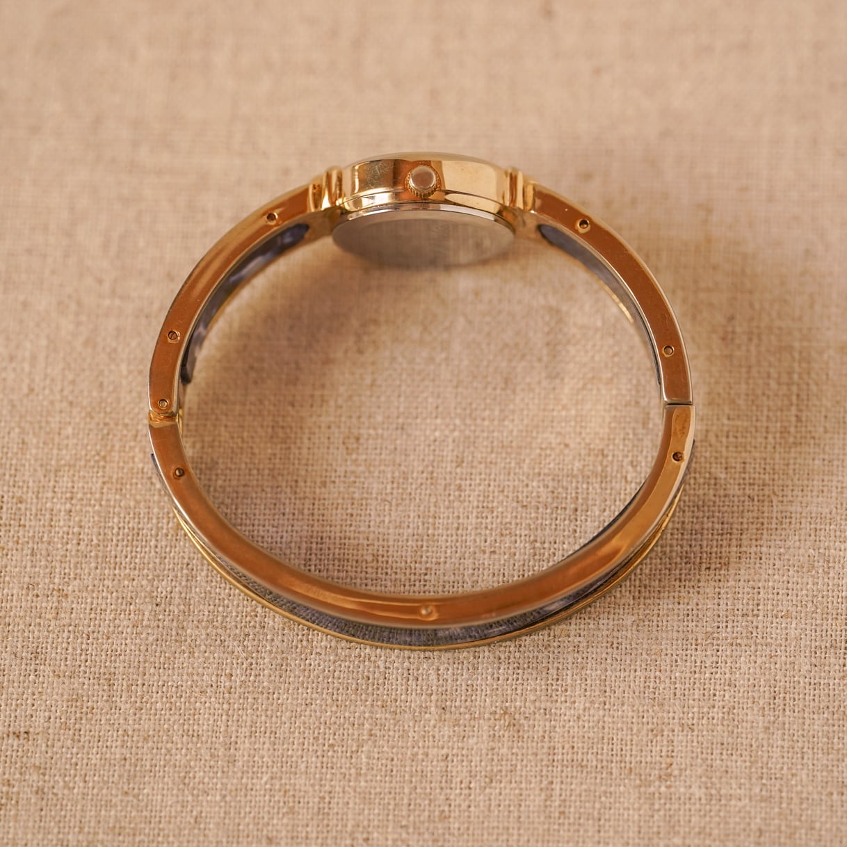 A vintage bangle watch adorned with a beautifully luminous light blue enamel. The deep blue tones harmonize with the rich vintage gold, enveloping the wrist in an air of sophistication and timeless elegance. Designed in a bangle style, this watch seamlessly blends the functionality of timekeeping with the refined aesthetics of jewelry. The clear blue enamel offers a subtle yet striking accent, making it perfect not only for formal occasions but also for adding a touch of understated elegance to everyday outings.