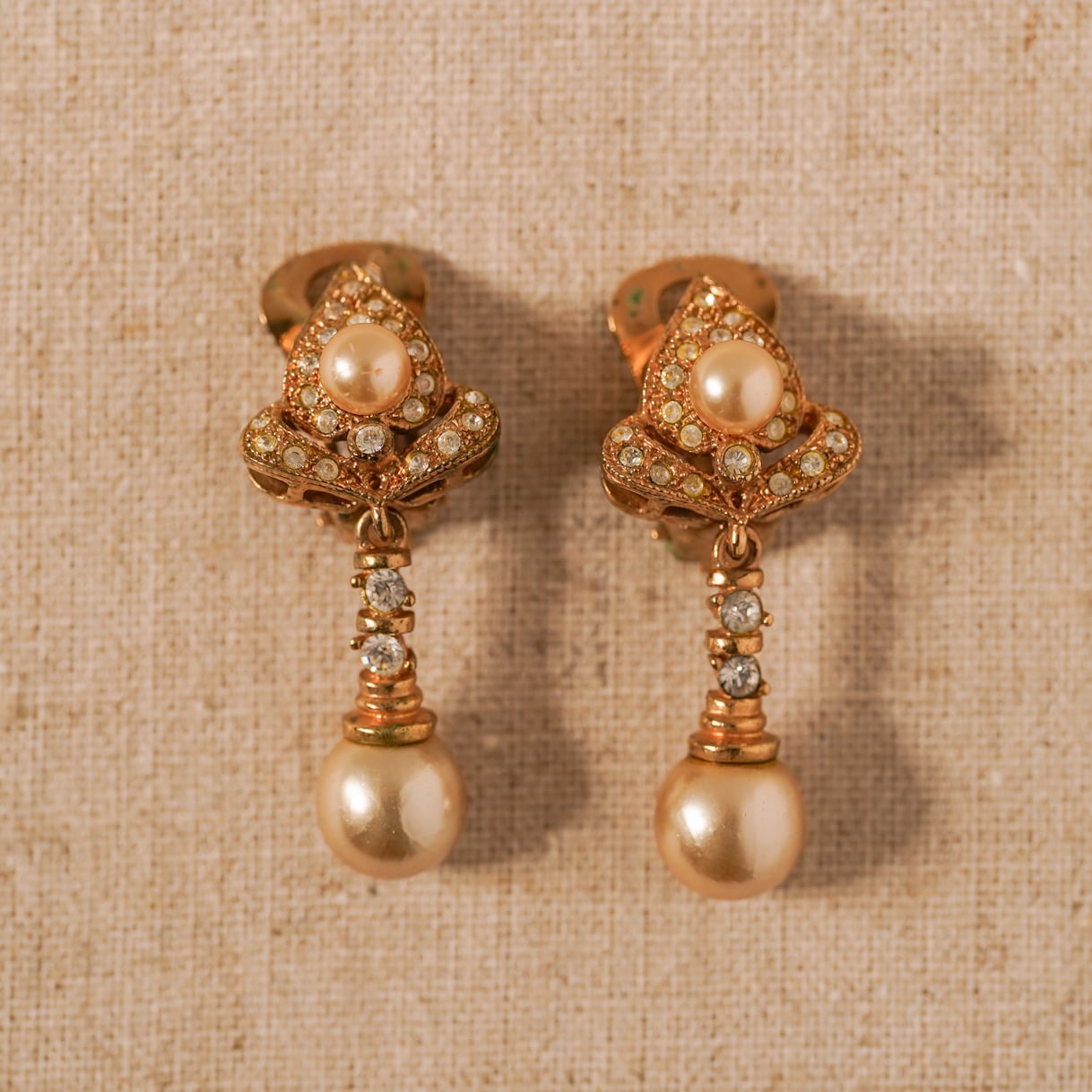 A stunning pair of vintage Art Nouveau-inspired earrings, featuring exquisite symmetry and intricate detailing. Tiny rhinestones and costume pearls are delicately arranged, infusing the abstract design with an air of elegance and sophistication. The deep, antique gold-tone enhances the brilliance of the rhinestones and the soft luster of the pearls, creating a refined and romantic aesthetic.