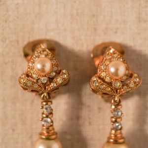 繊細なディテールと美しいシンメトリーが際立つ、アール・ヌーヴォーデザインのヴィンテージイヤリング。極小のラインストーンとコスチュームパールが絶妙なバランスであしらわれ、抽象的なフォルムに気品と華やかさを添えています。ヴィンテージゴールドの深みのある色合いが、ラインストーンやパールの光沢を際立たせ、エレガントでロマンティックな印象を演出。