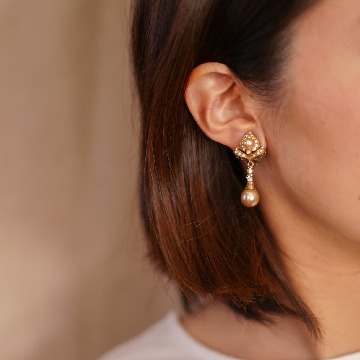 Akane SatoのCo-ordinate Recommend(オススメコーデ): 春夏には、アイボリーやシャンパンカラーのシルクブラウス、またはレースディテールのドレスと合わせ、イヤリングのヴィンテージゴールドとパールの気品を際立たせるスタイルに。華奢なゴールドジュエリーと重ねることで、よりクラシカルなエレガンスが際立ちます。秋冬には、バーガンディやディープグリーンのベルベットトップスや、クラシカルなツイードジャケットと合わせて、アール・ヌーヴォーの芸術的なディテールをモダンに楽しむのもおすすめ。特別なシーンにも映える、タイムレスなイヤリングです。
