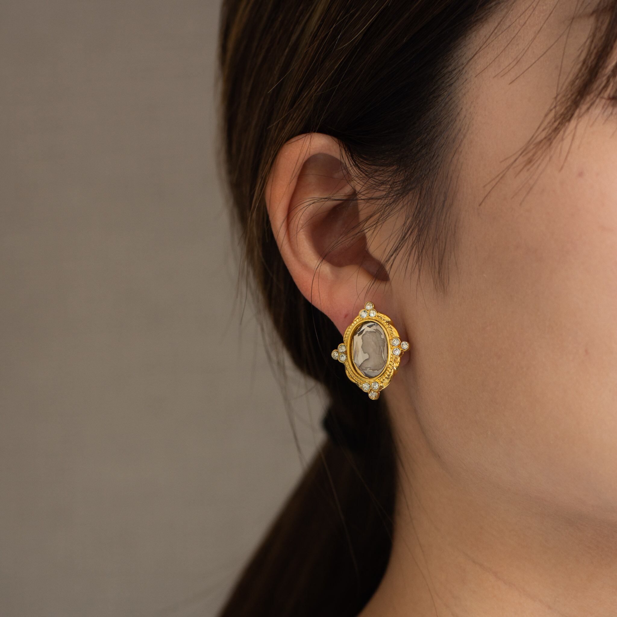 丁寧にハンドエングレービングされたカメオモチーフが特徴のヴィンテージイヤリング。一般的なカメオジュエリーとは異なり、インタリオに近い質感とスモーキーなシルバートーンが新鮮で、王道のカメオモチーフを洗練されたハンサムな印象に仕上げています。カメオの甘さを抑えたデザインをお探しの方にぴったりの一品。クラシカルなゴールドフレームがカメオの気品を引き立て、極小のラインストーンが繊細な輝きを添えます。さらに、カメオが向かい合うようにデザインされている点も、当時の職人のこだわりが感じられる魅力的なポイントです。