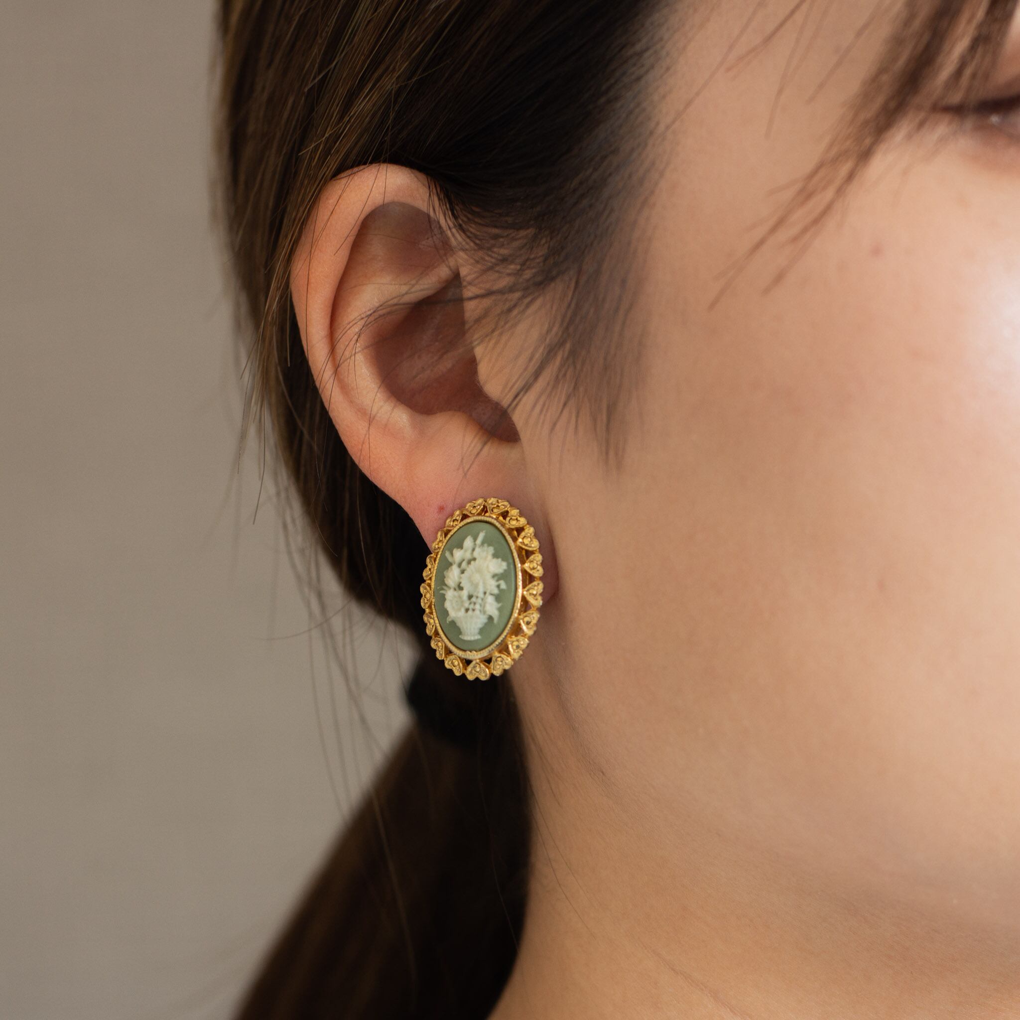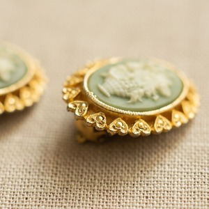 丁寧にハンドエングレービングされたブーケモチーフのカメオが美しいヴィンテージイヤリング。セラミックのやさしい質感と、ミントグリーンとアイボリーホワイトの穏やかなトーンが落ち着いた気品を演出します。クラシカルなゴールドフレームには、実は小さなハートが集まった愛らしいディテールが施されており、細部に宿るこだわりが魅力的。ヴィンテージジュエリーならではの、発見する楽しみを存分に味わえるアイテムです。コレクター価値の高い、タイムレスな一品。